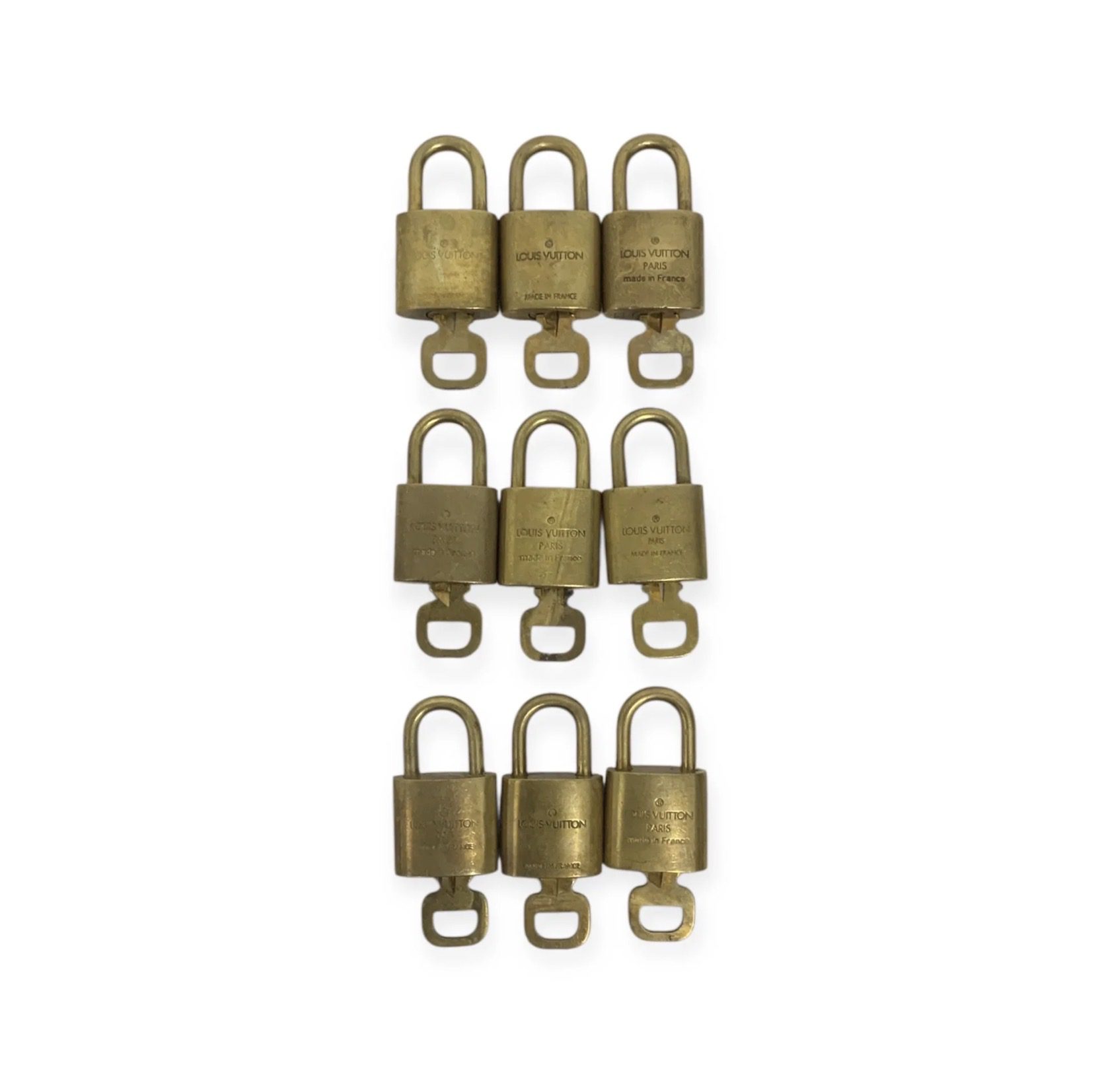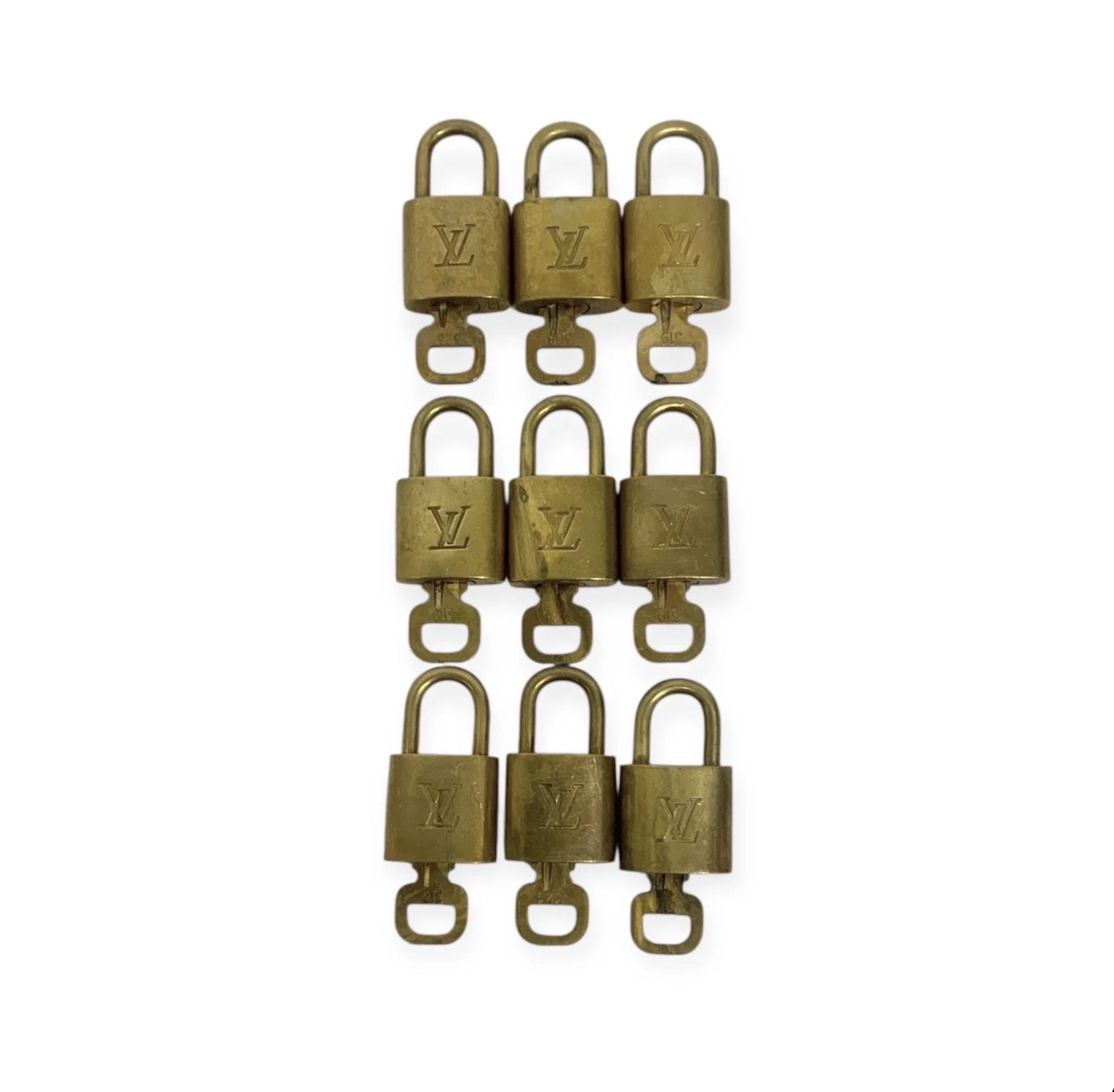 (90D)VINTAGE LOUIS VUITTON PADLOCK WITH 1X KEY (FAIR CONDITION SHOWS VISIBLE SIGNS OF USAGE AND TARNISHING))
