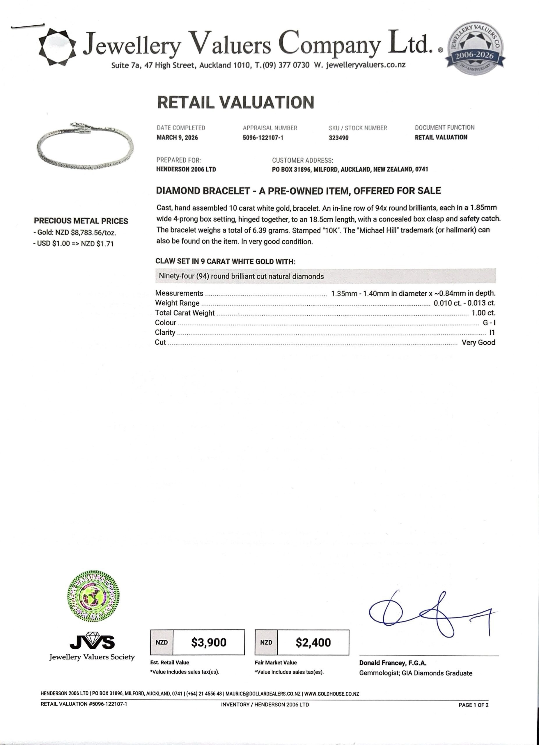 10CT WG GOLD TENNIS BRACELET 6.4GMS TDW1.00CTS + VAL