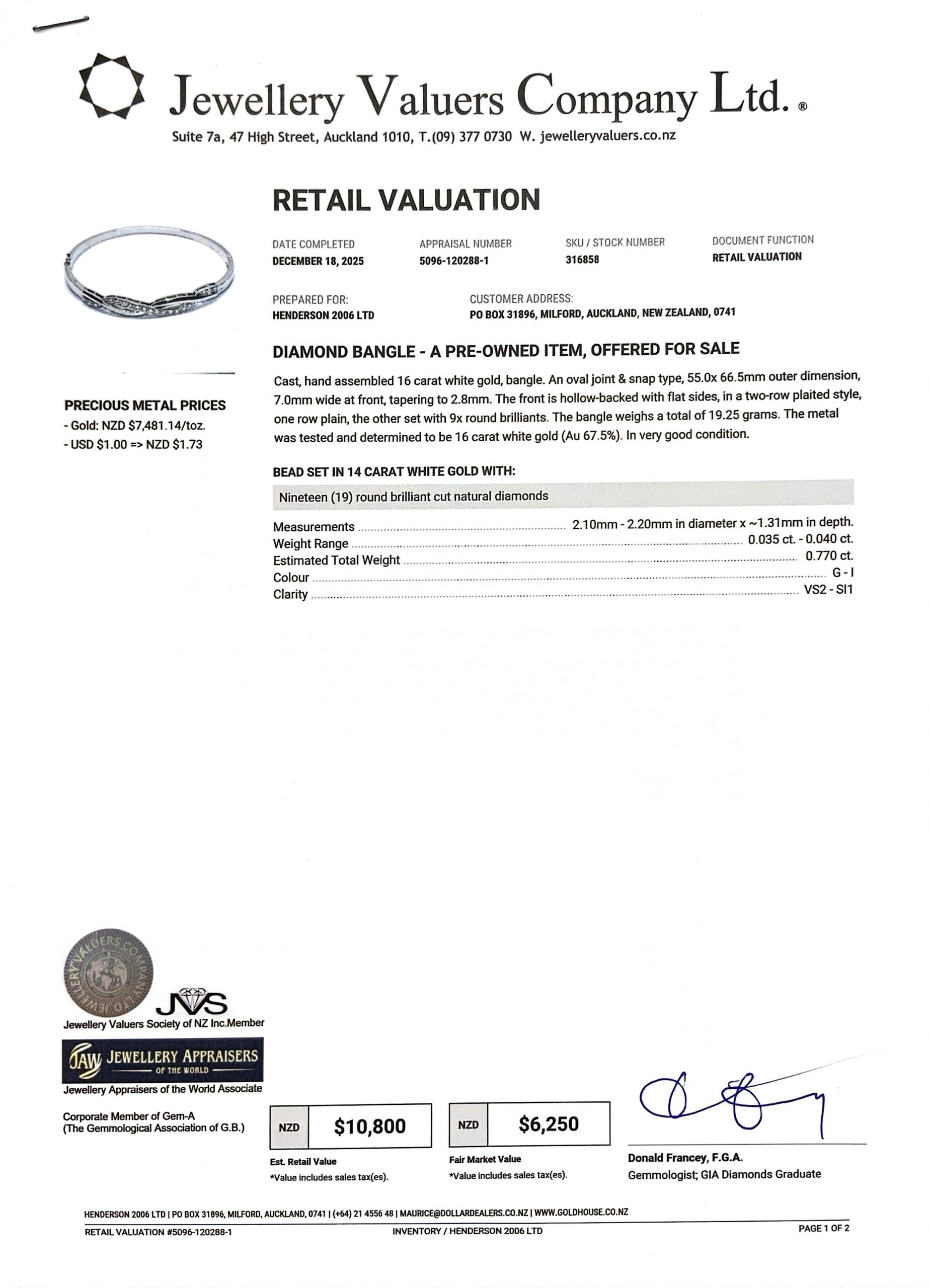16CT W/G GOLD BANGLE 19.3GMS TDW0.77CTS + VAL