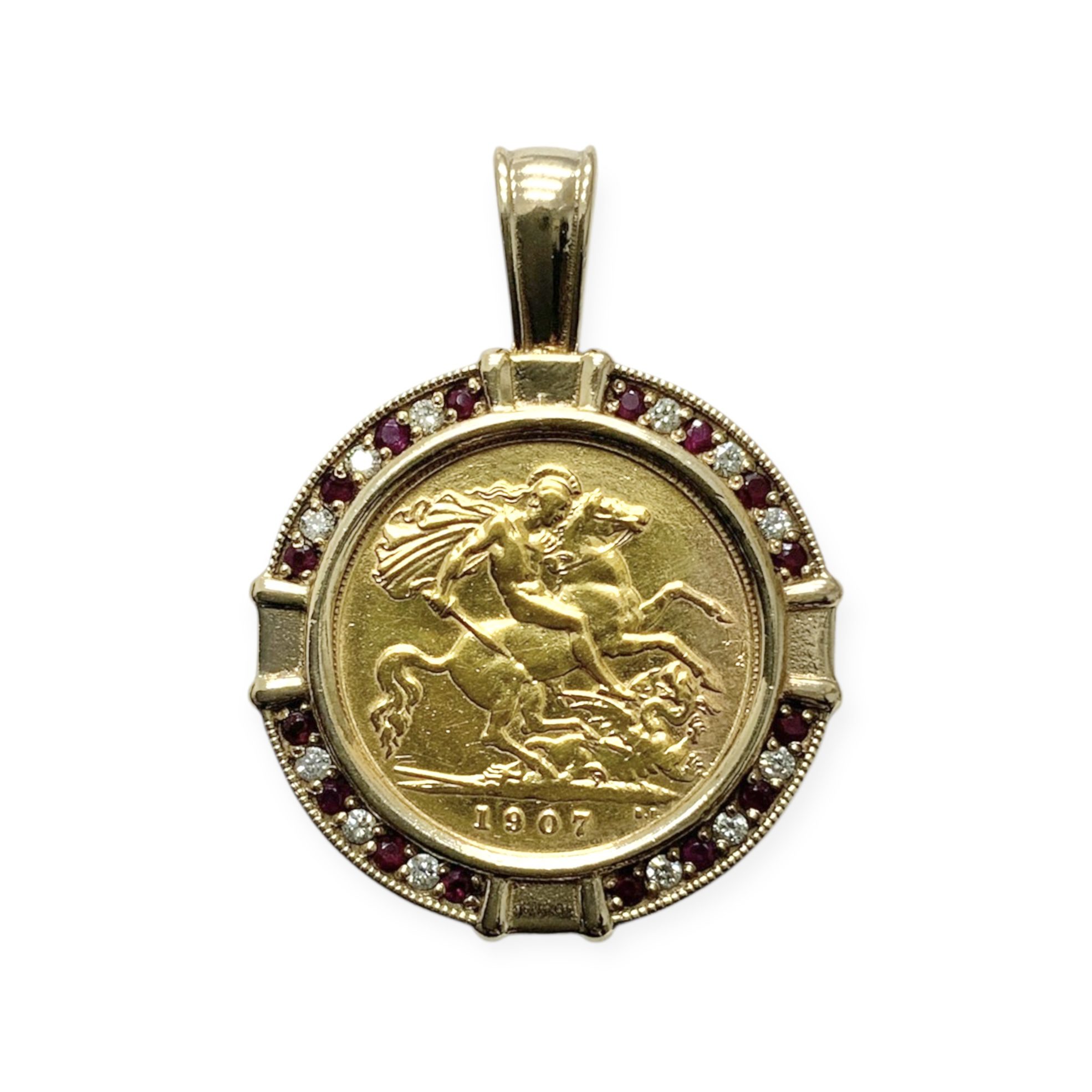 9CT YG GOLD 1907HALF SOVEREIGN PENDANT 9.7GMS TDW0.12CTS RUBY