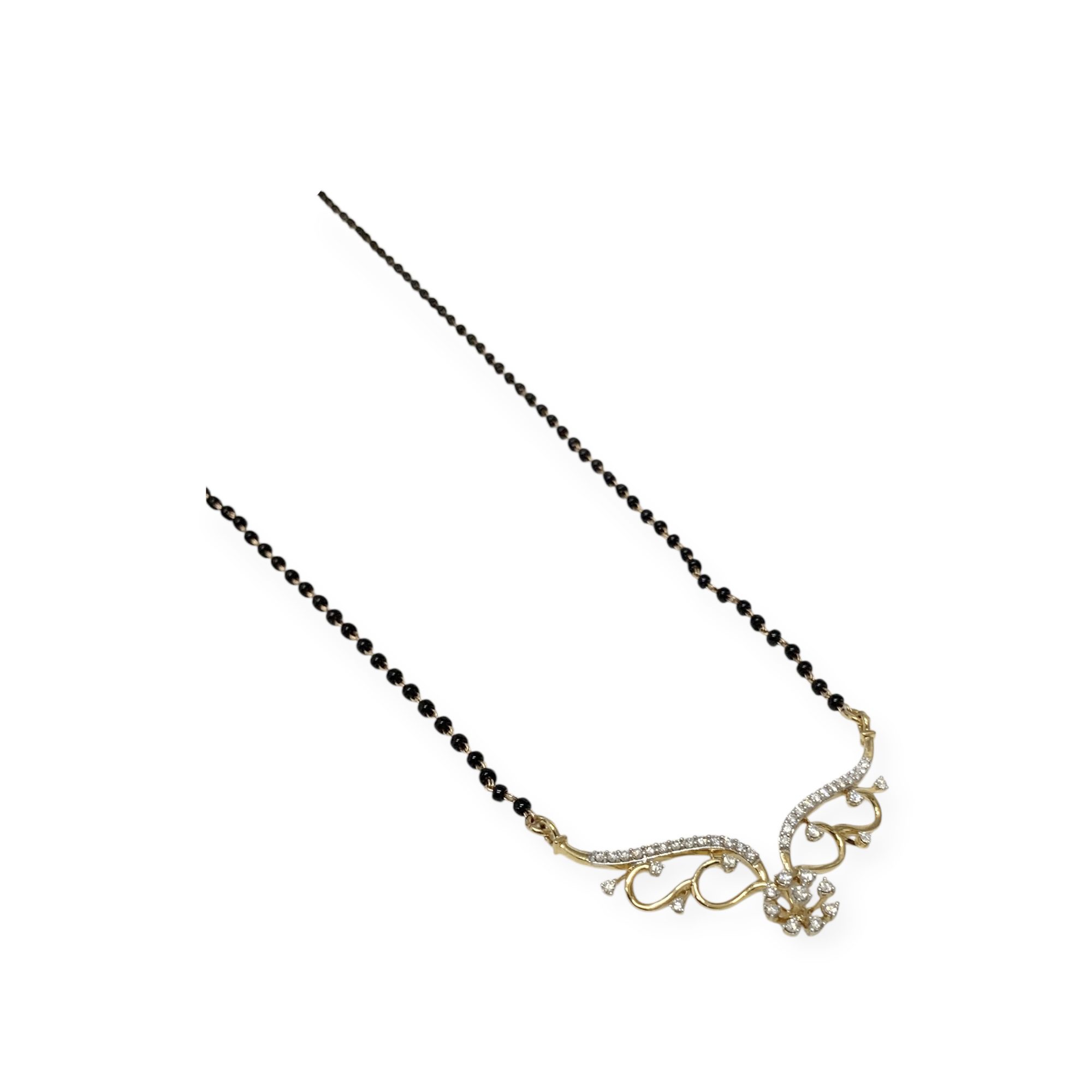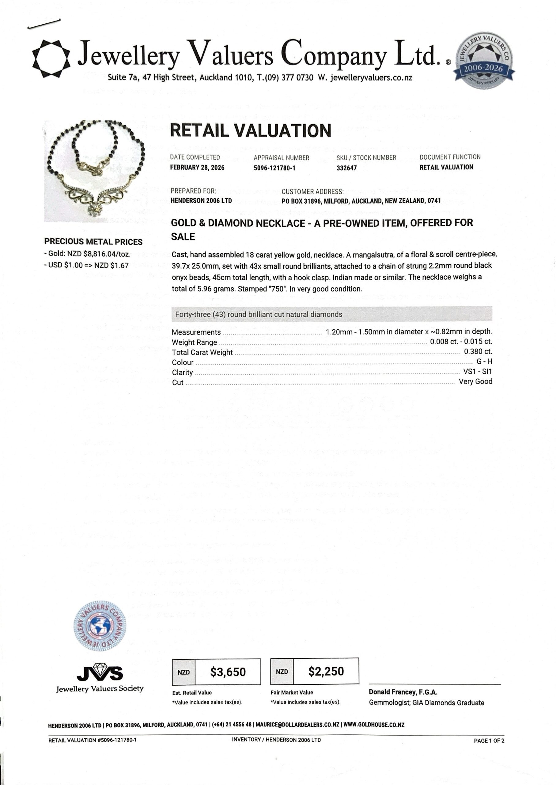 18CT YG GOLD NECKLACE 5.9GMS BLACK ONYX BEADS +DIA TDW0.38CTS + VAL