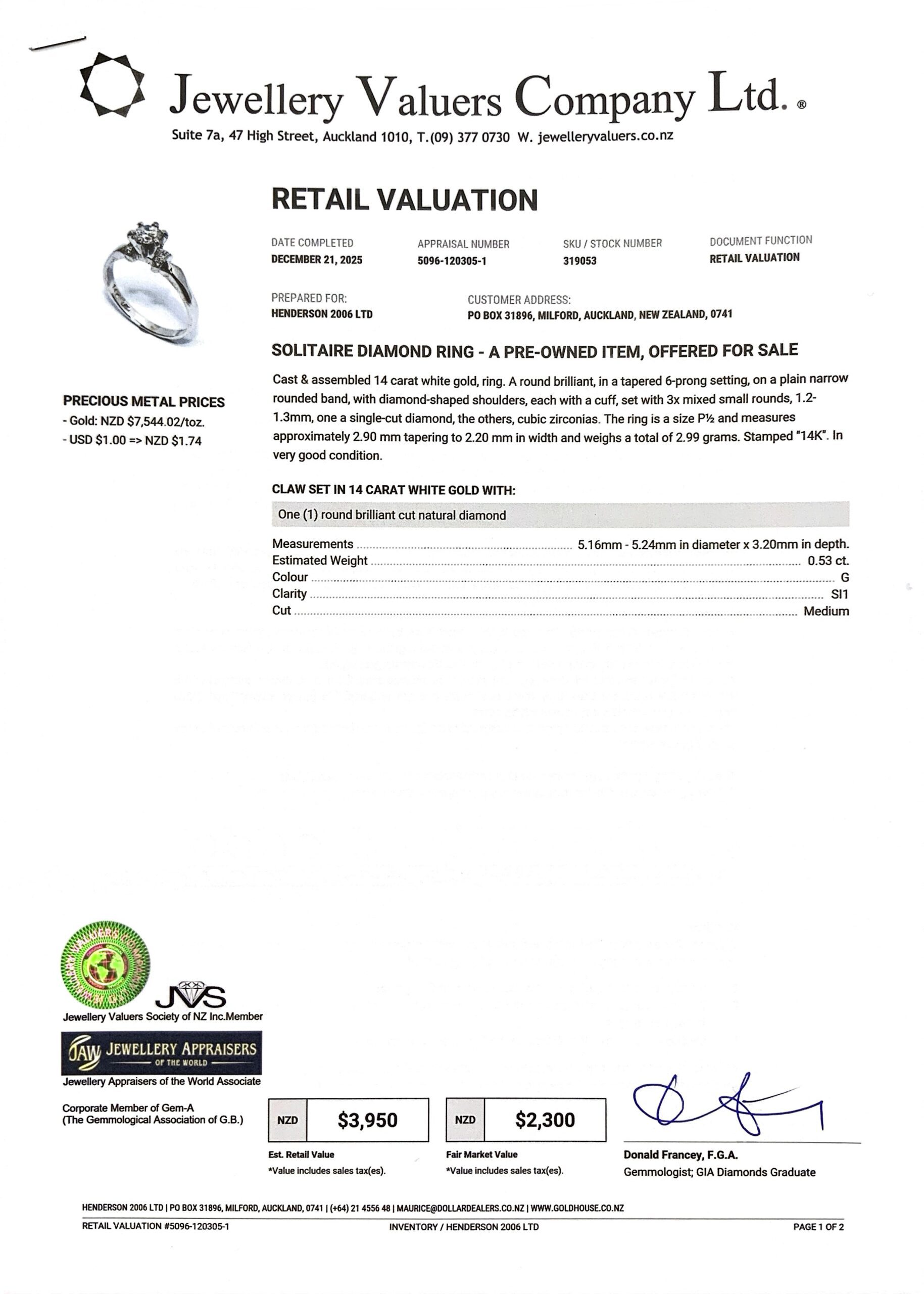 14CT W/G GOLD SOLITAIRE RING 3.0GMS TDW0.53CTS +CUBIC ZIRCONIAS + VAL