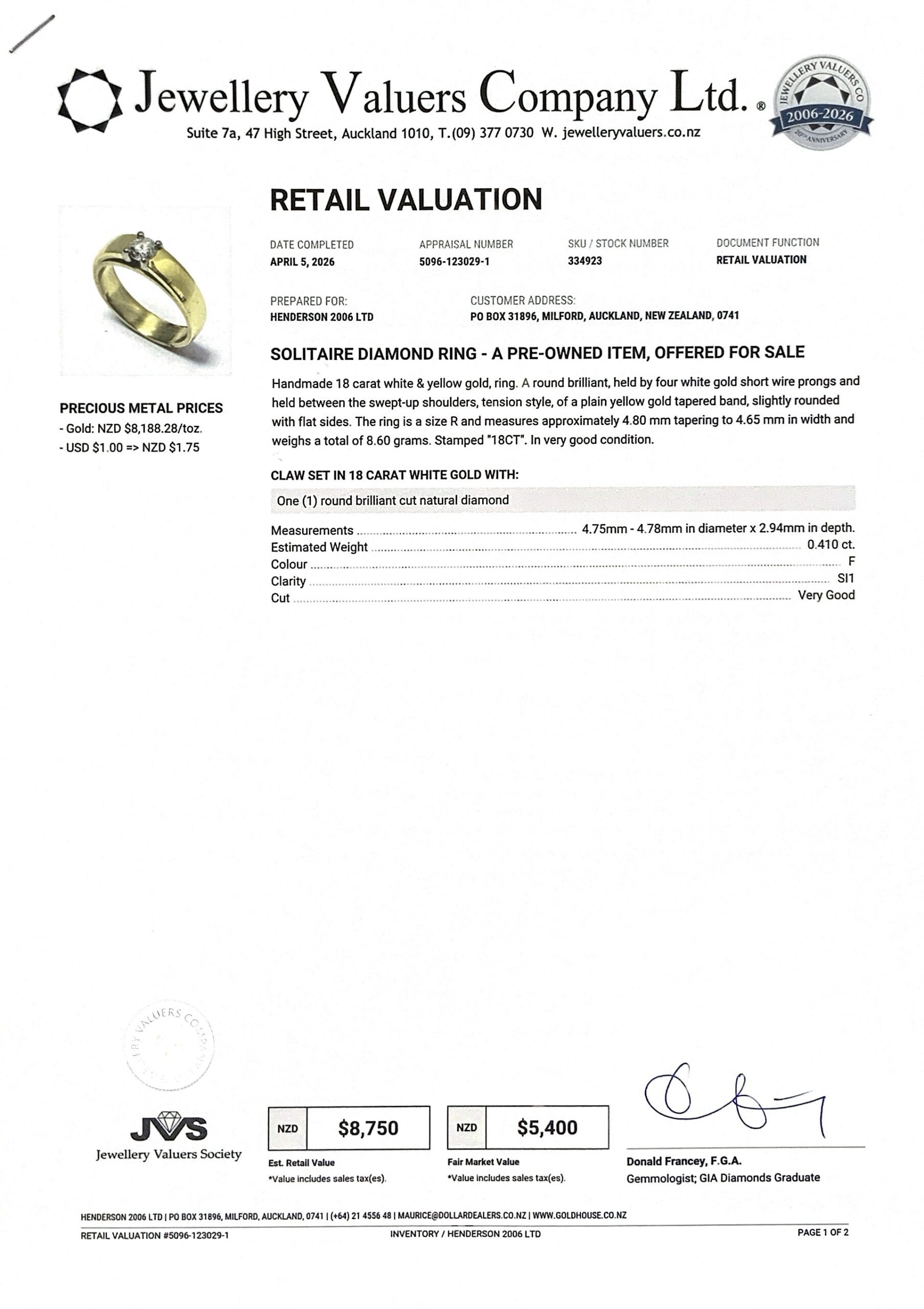 18CT YG GOLD RING 8.6GMS TDW0.41CTS F SI1 + VAL