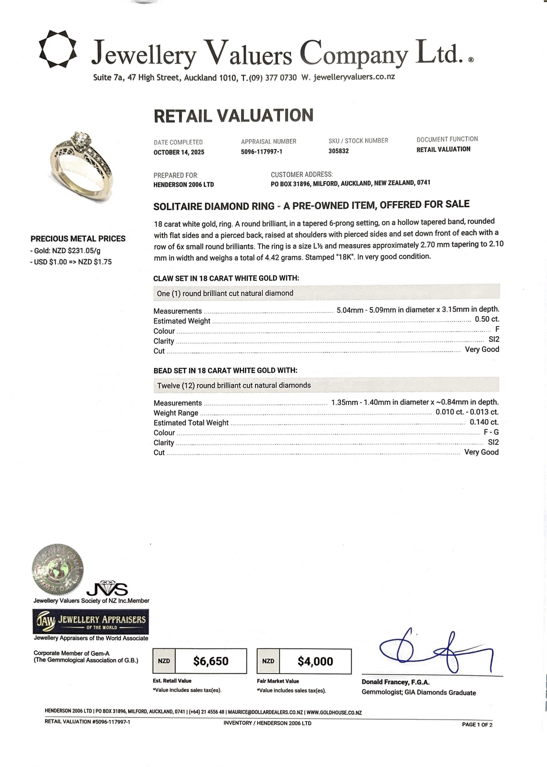 18CT W/G GOLD SOLITAIRE RING 4.42GMS TDW0.64CTS + VAL
