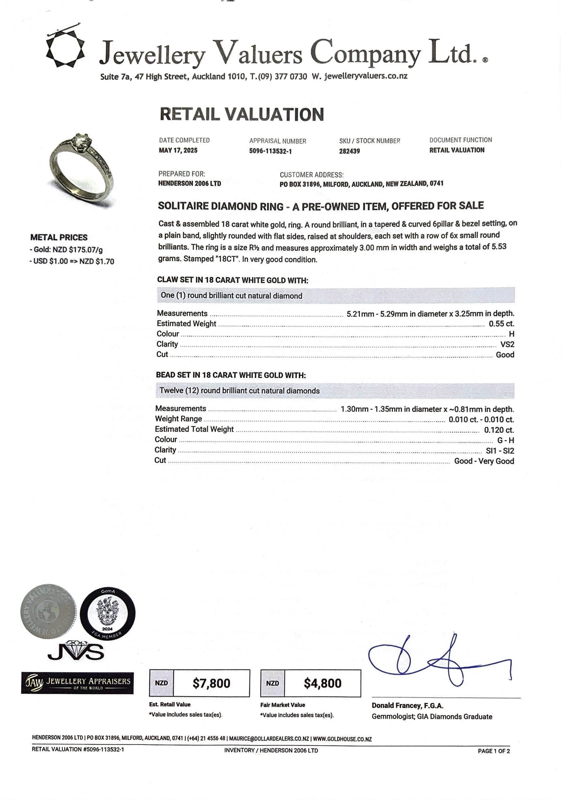18CT WG GOLD SOLITARE RING 5.5GMS TDW0.67CTS + VAL