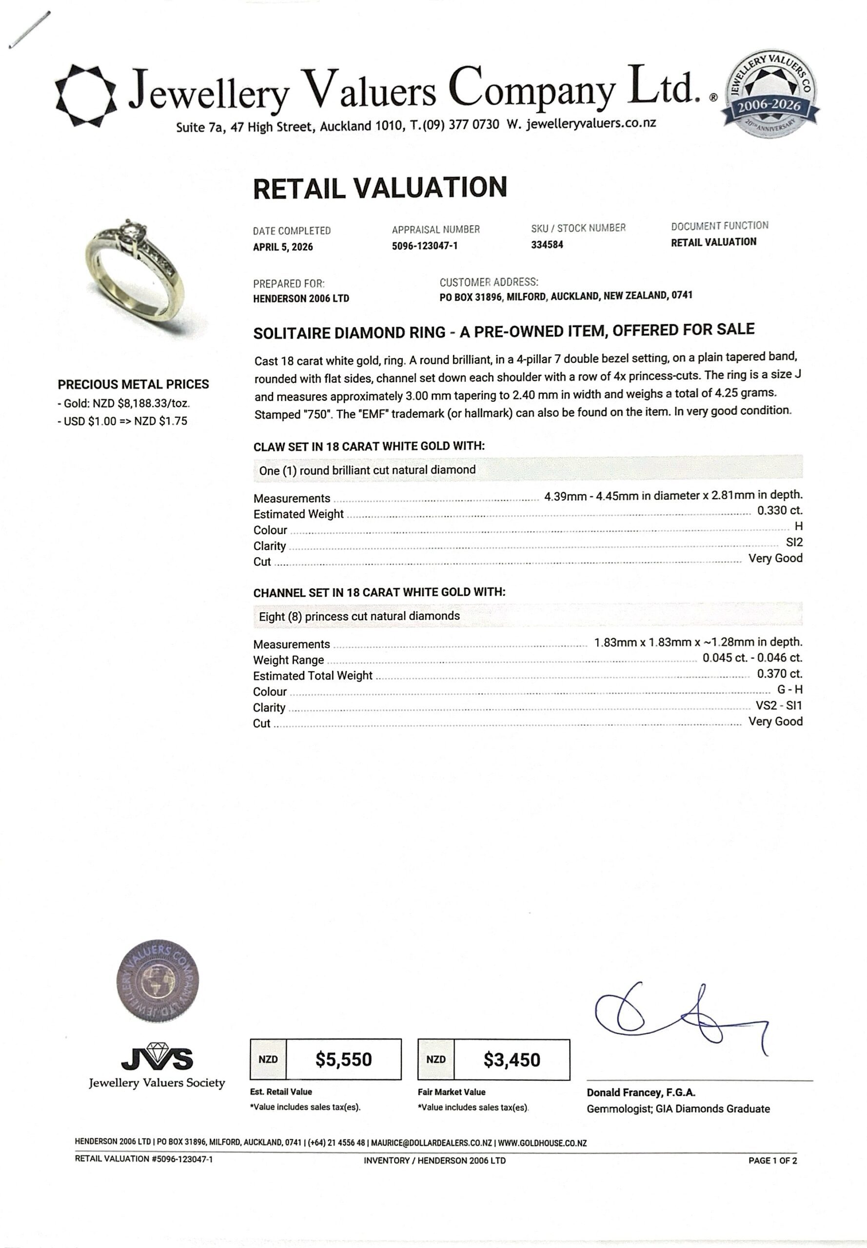 18KT WG GOLD SOLITAIRE RING 4.2GMS TDW0.70CTS CNTRE 0.33CT H SI2 + VAL