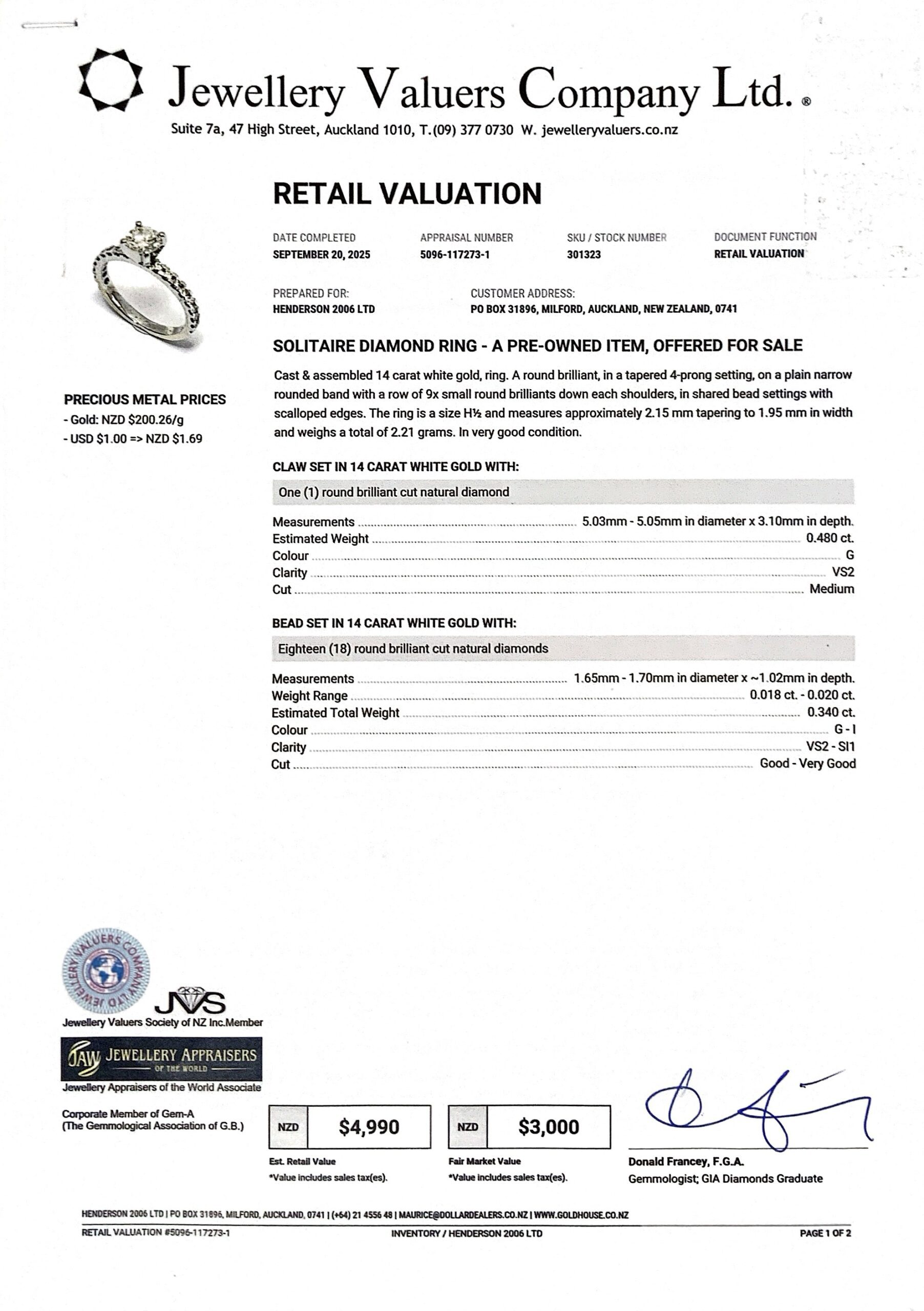 14CT WG GOLD SOLIATIRE RING 2.2GMS TDW0.82CTS + VAL