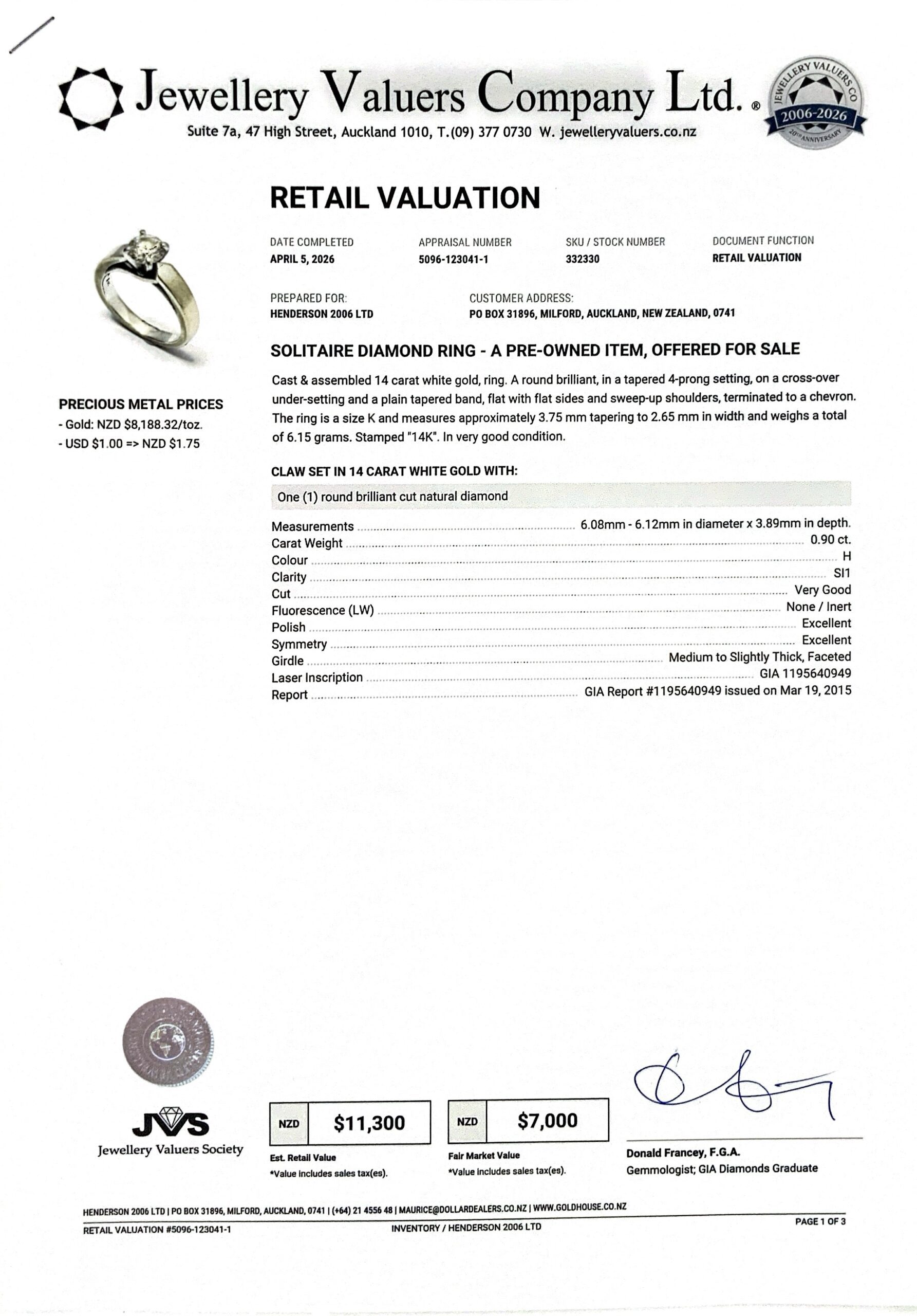 14CT WG GOLD SOLITAIRE RING 6.1GMS TDW0.90CTS H SI1 + GIA + VAL