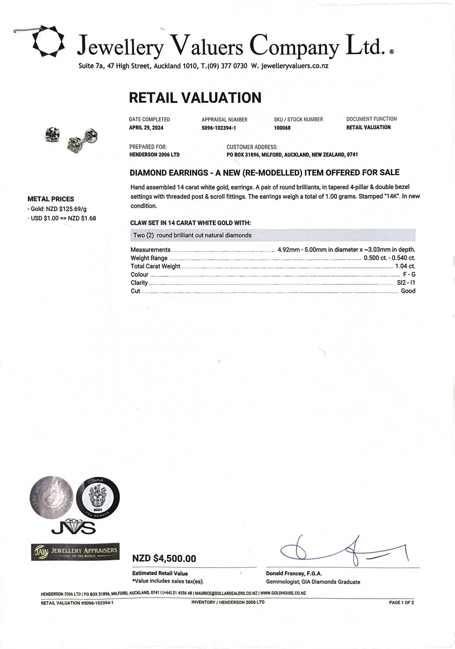 14KT W/G GOLD STUD EARRINGS TDW1.04CTS 1GMS (NEW-REMODELLED) + VAL