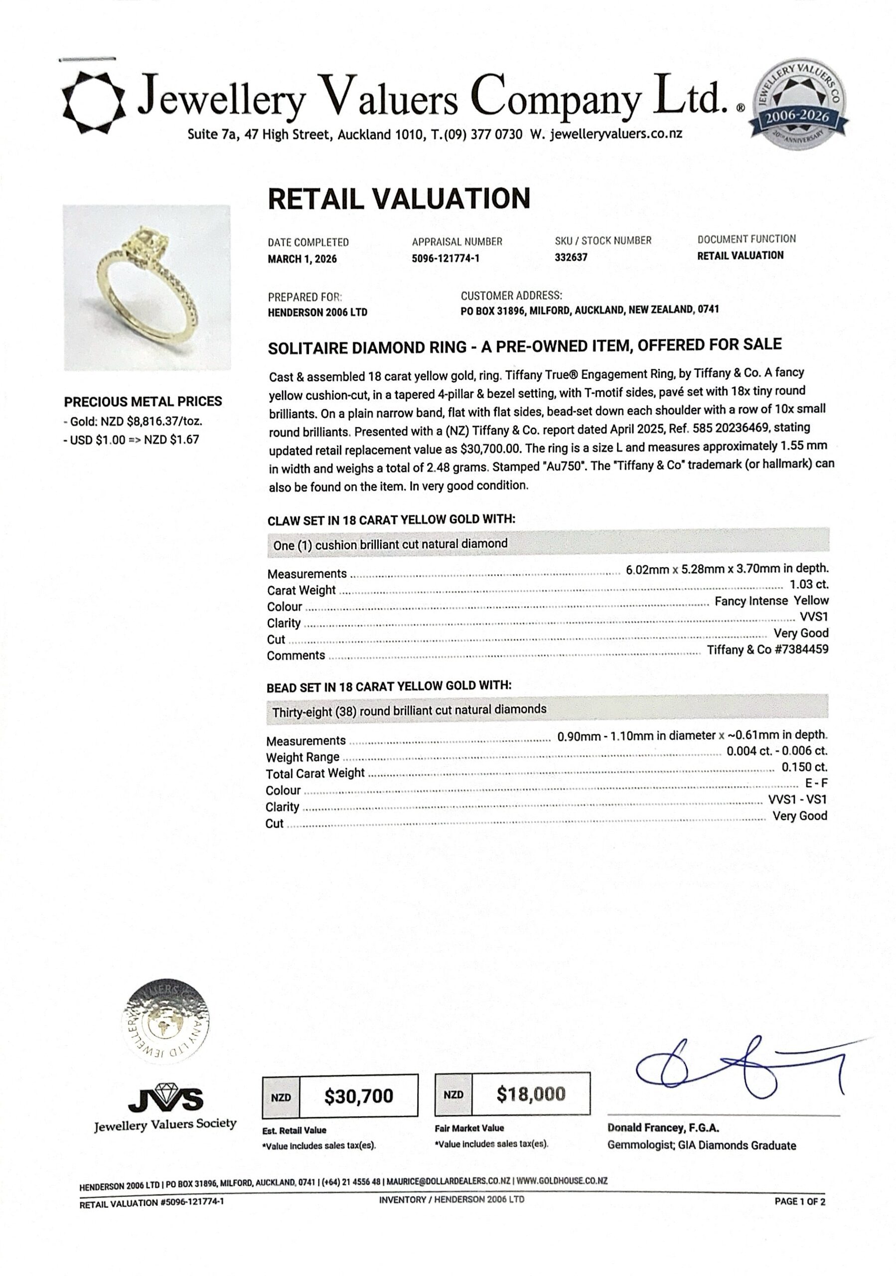 18CT YG GOLD TIFFANY & CO SOLITIRAE RING 2.4GMS TDW1.18CTS + VAL