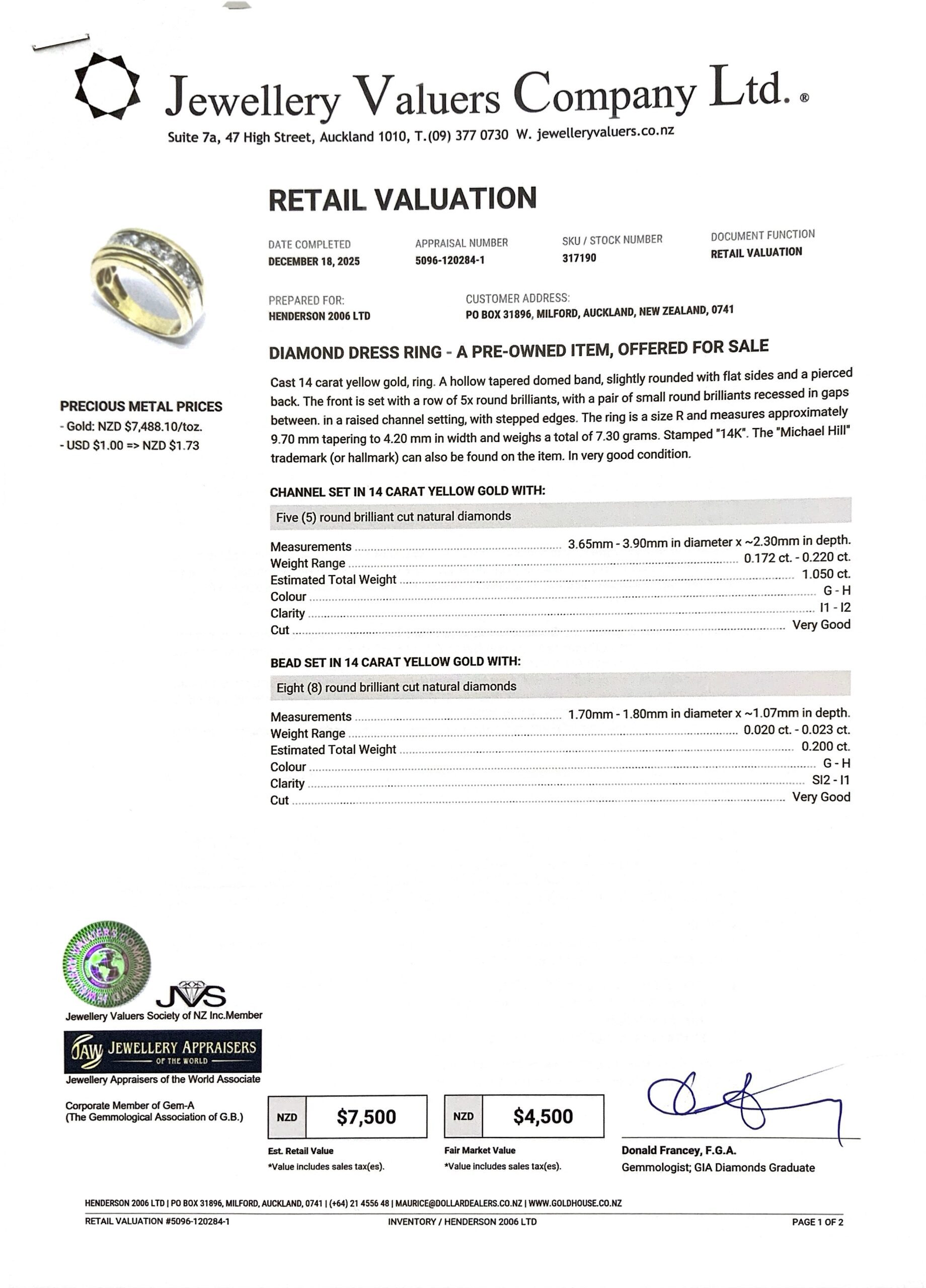 14CT YG GOLD RING 7.4GMS TDW1.25CTS + VAL