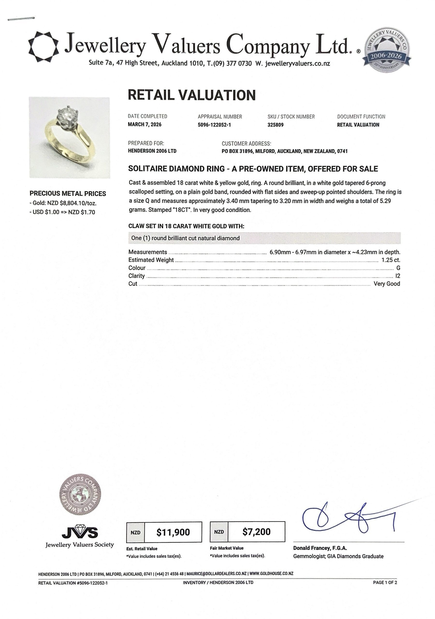 18CT Y/G GOLD SOLITAIRE RING 5.4GMS TDW1.25CTS G I2 + VAL