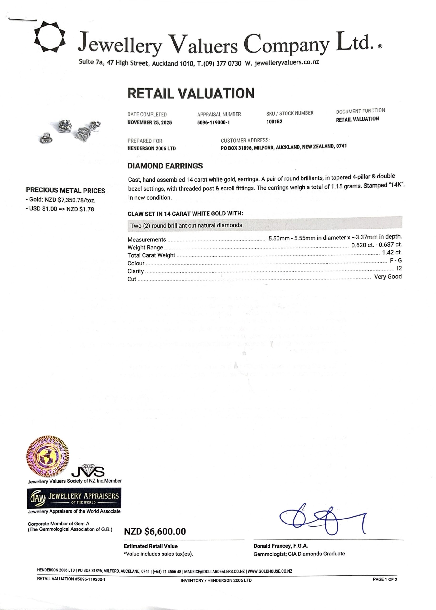 14KT WG GOLD STUD EARRINGS TDW1.42CTS 1.2GMS + VAL