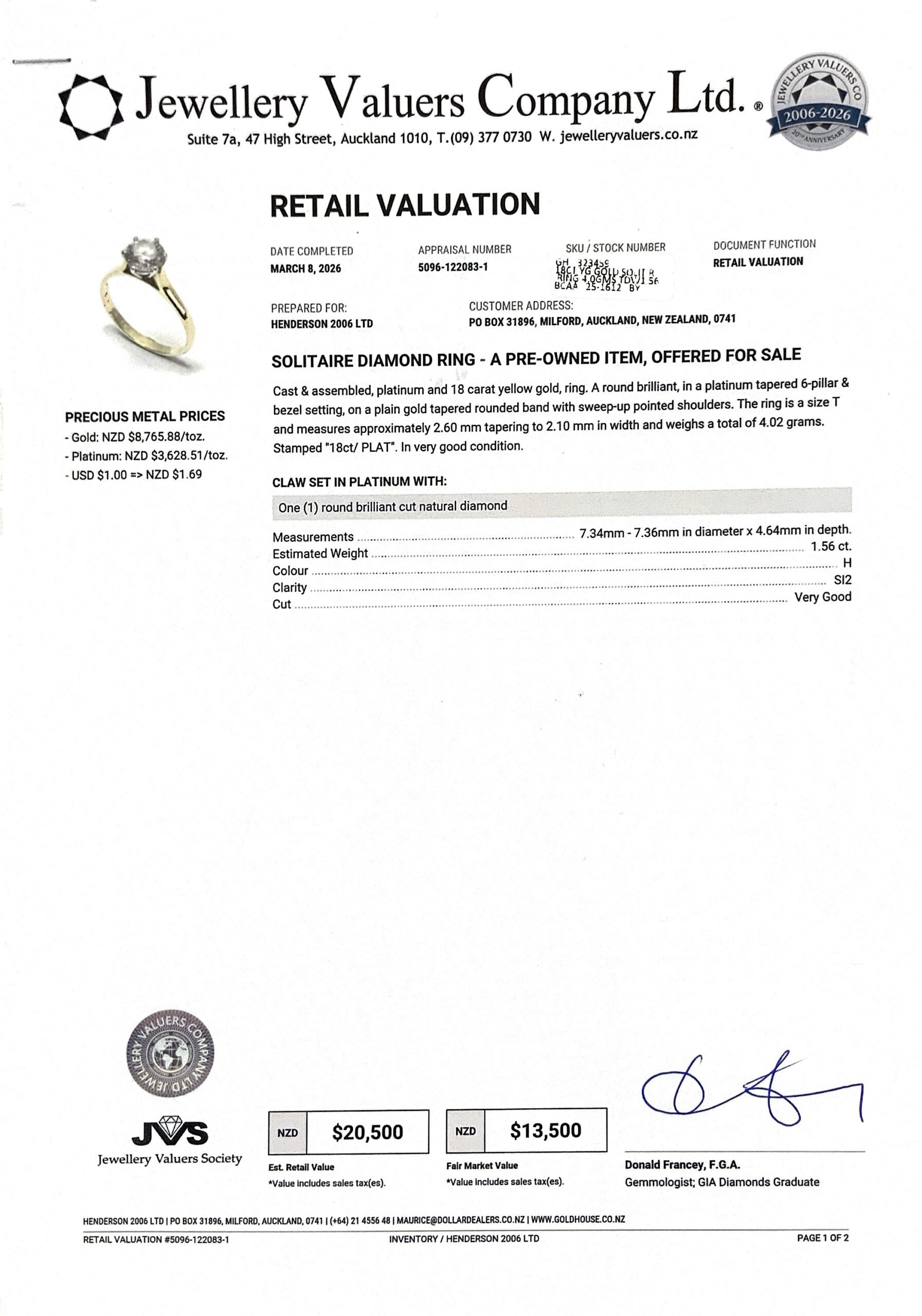 18CT YG GOLD SOLITIRE RING 4.0GMS TDW1.56CTS H SI2 + VAL