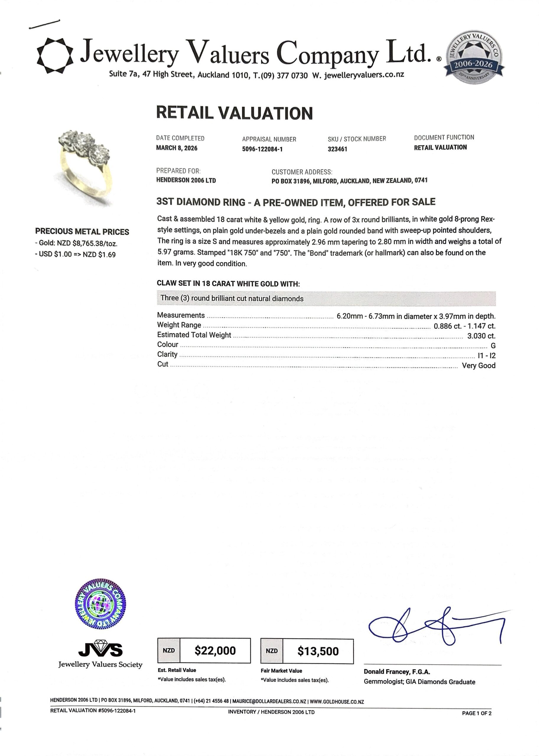 18CT YG GOLD 3 STONE RING 6.0GMS 18CT TDW3.03CTS + VAL