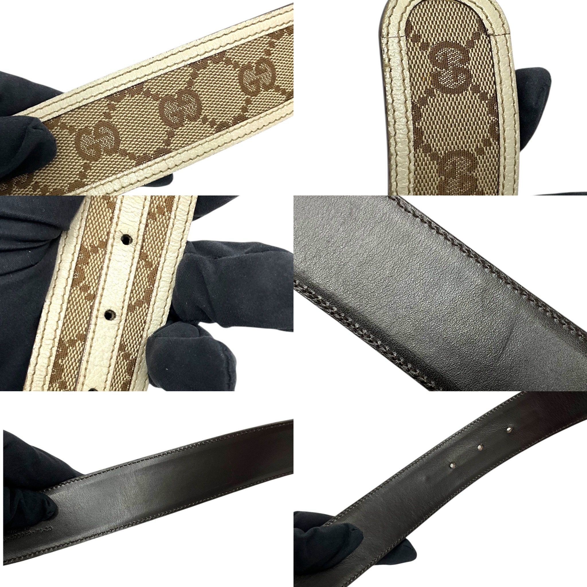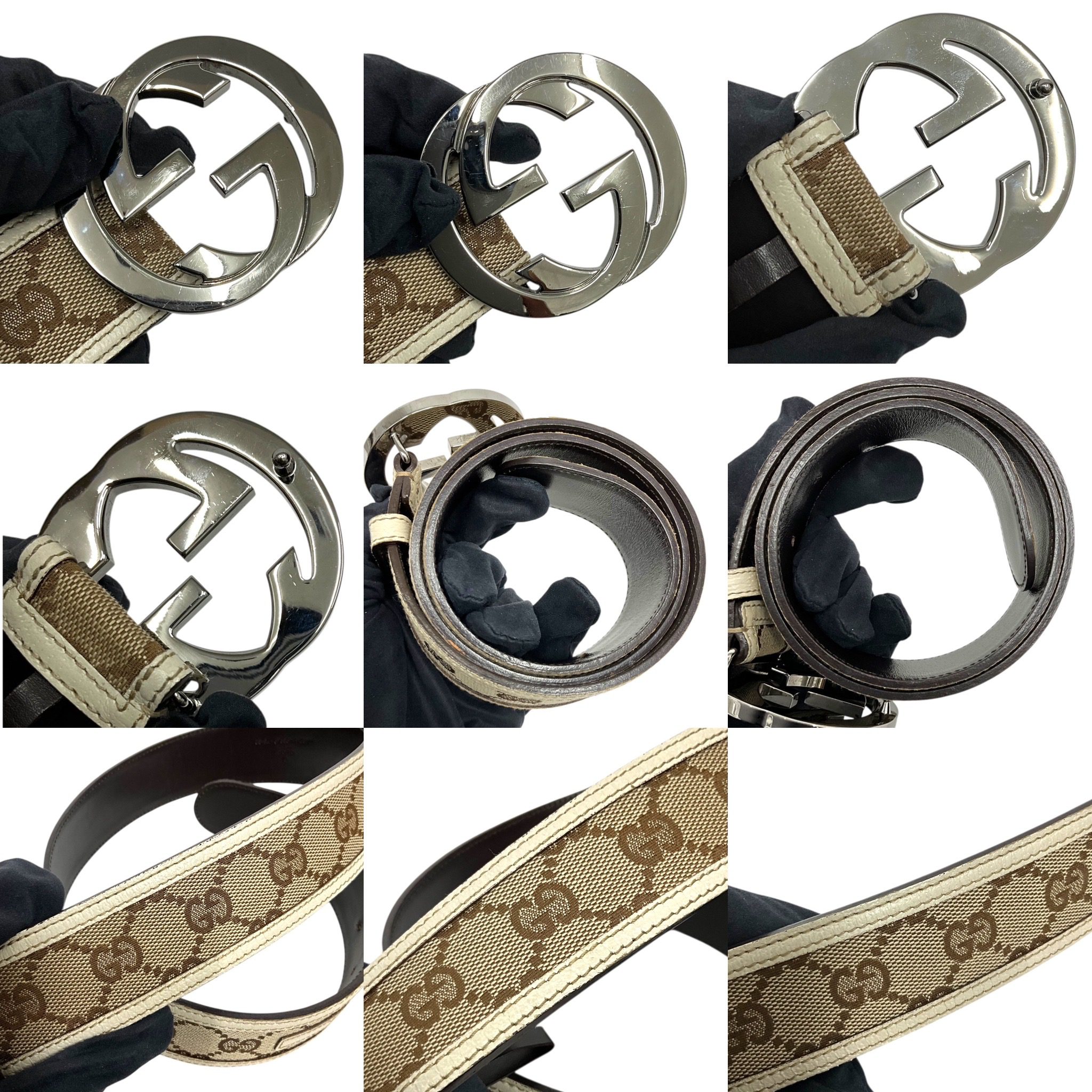 GUCCI INTERLOCKING G BUCKLE CANVAS BELTS/N:11487649949 NO D/B FAIR CONDITION SHOWS VISIBLE SIGNS OF USAGE MOSTLY WEAR ON CANVAS AND LEATHER TRIMS HEAVY VISIBLE SCRATHES ON BUCKLE AS PICTURED