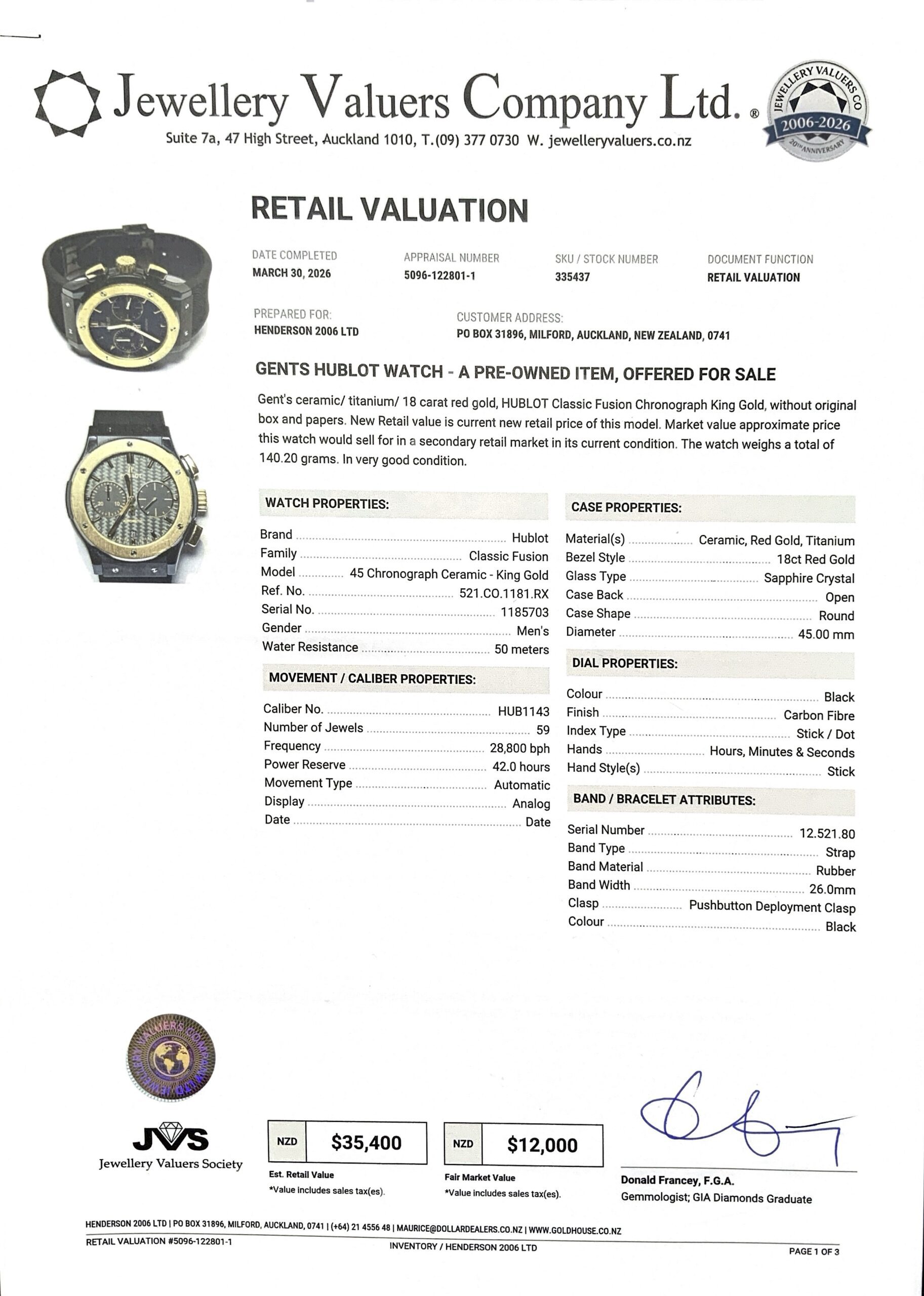 HUBLOT CLASSIC FUSION KING CERAMIC TITANIUM AND RED GOLD 45MM WATCH 140.0GMS 521.CO.1181.RX S/N:1185703 + VAL (SHOWS SOME SIGNS OF USAGE)