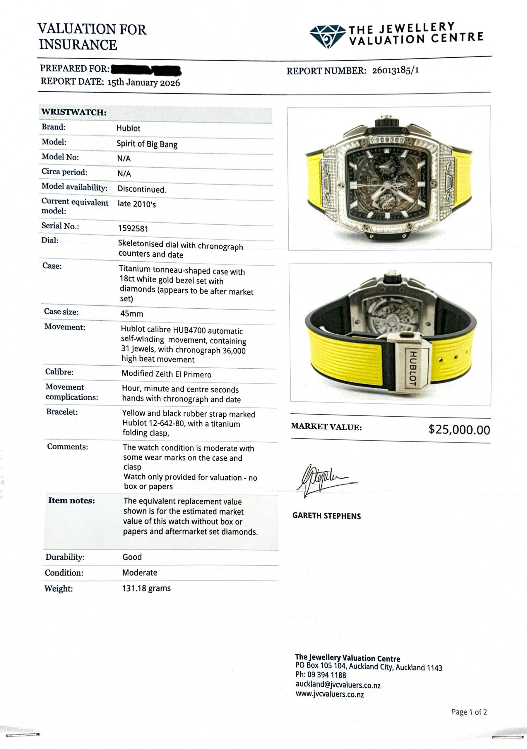 HUBLOT WATCH 131.1GMS SPIRIT OF BIG BANG S/N:1592581 + VAL