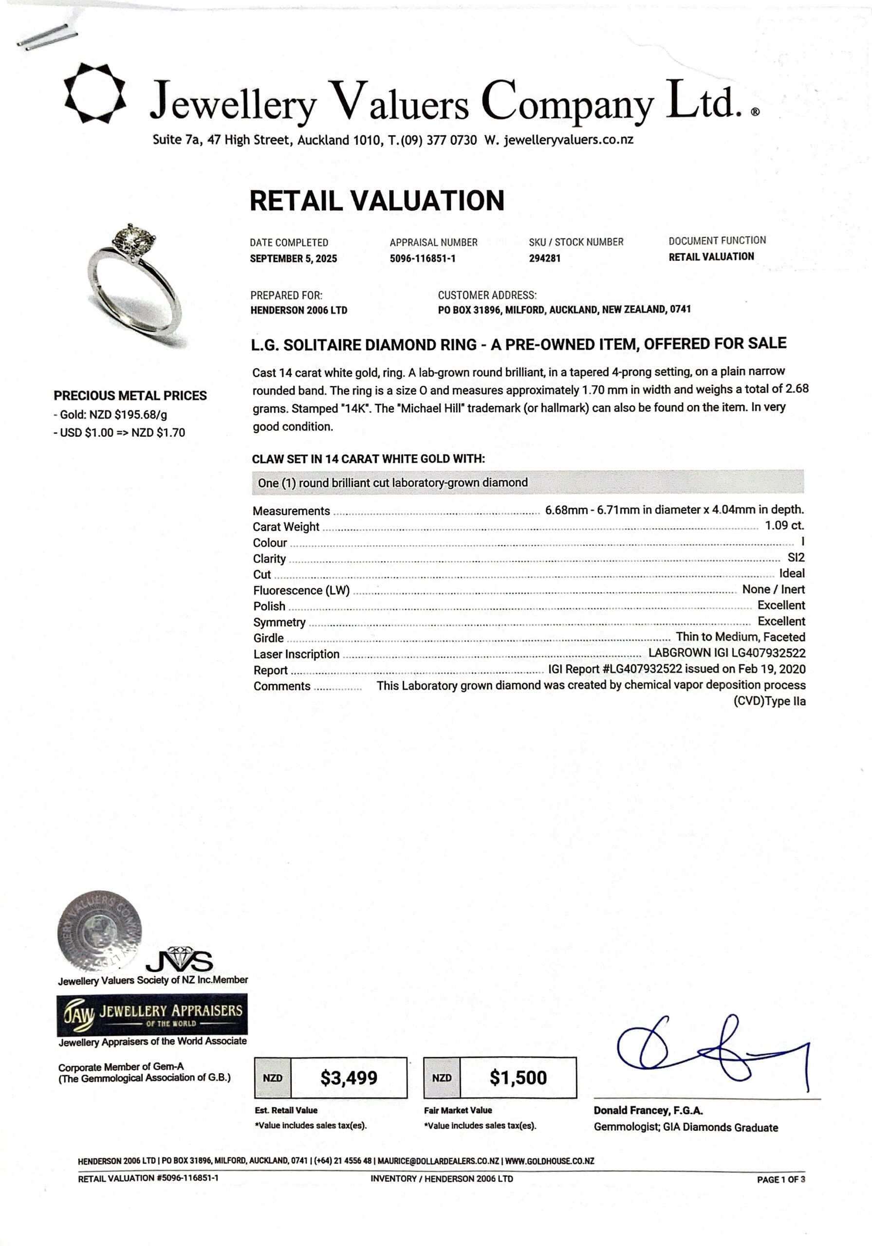 14CT WG GOLD L AB SOLITAIRE RING 2.8GMS TDW1.09CTS + VAL