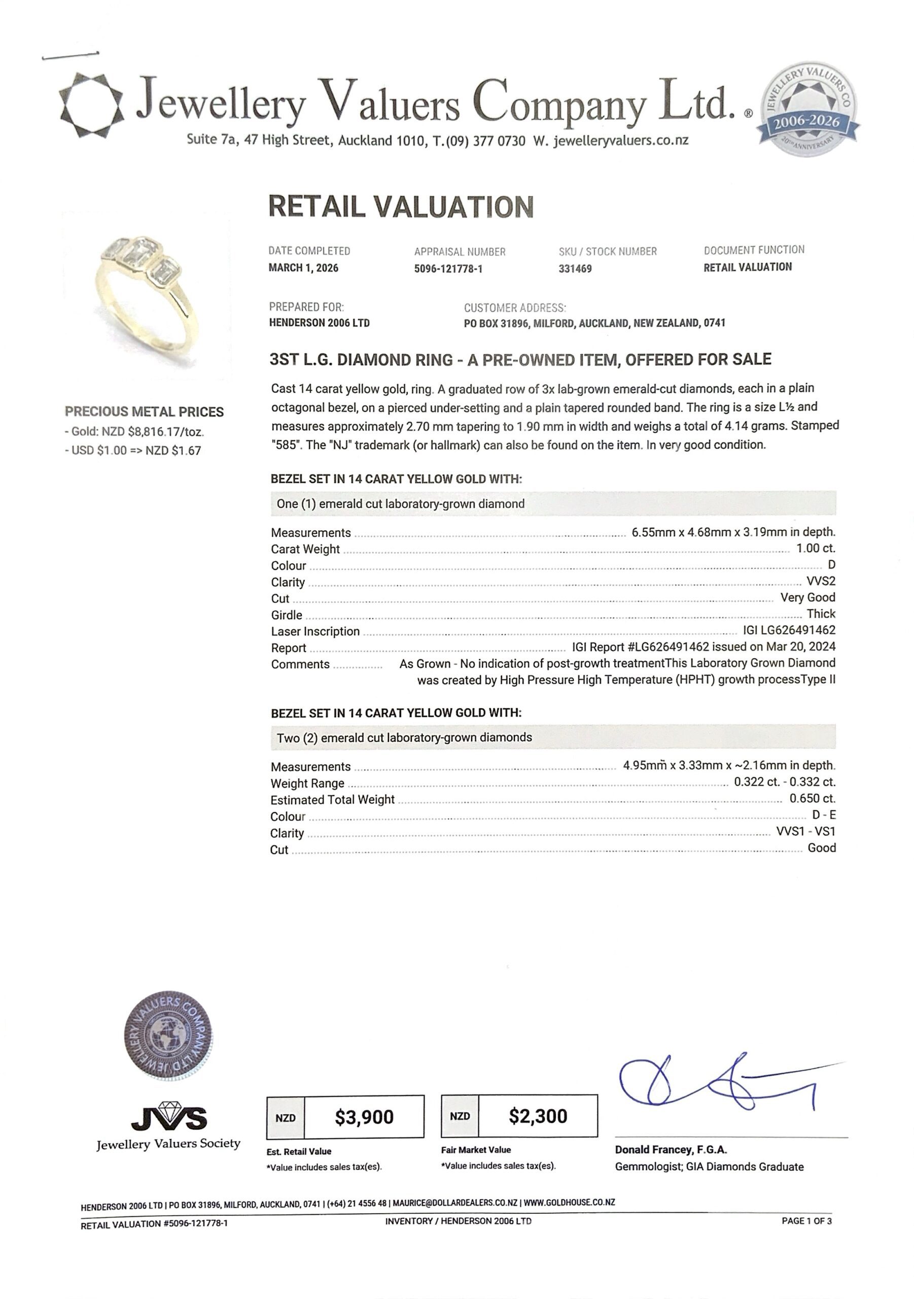 14CT YG GOLD 3 STONE RING 4.1GMS LAB DIAMOND TDW1.65CTS + CERT + VAL