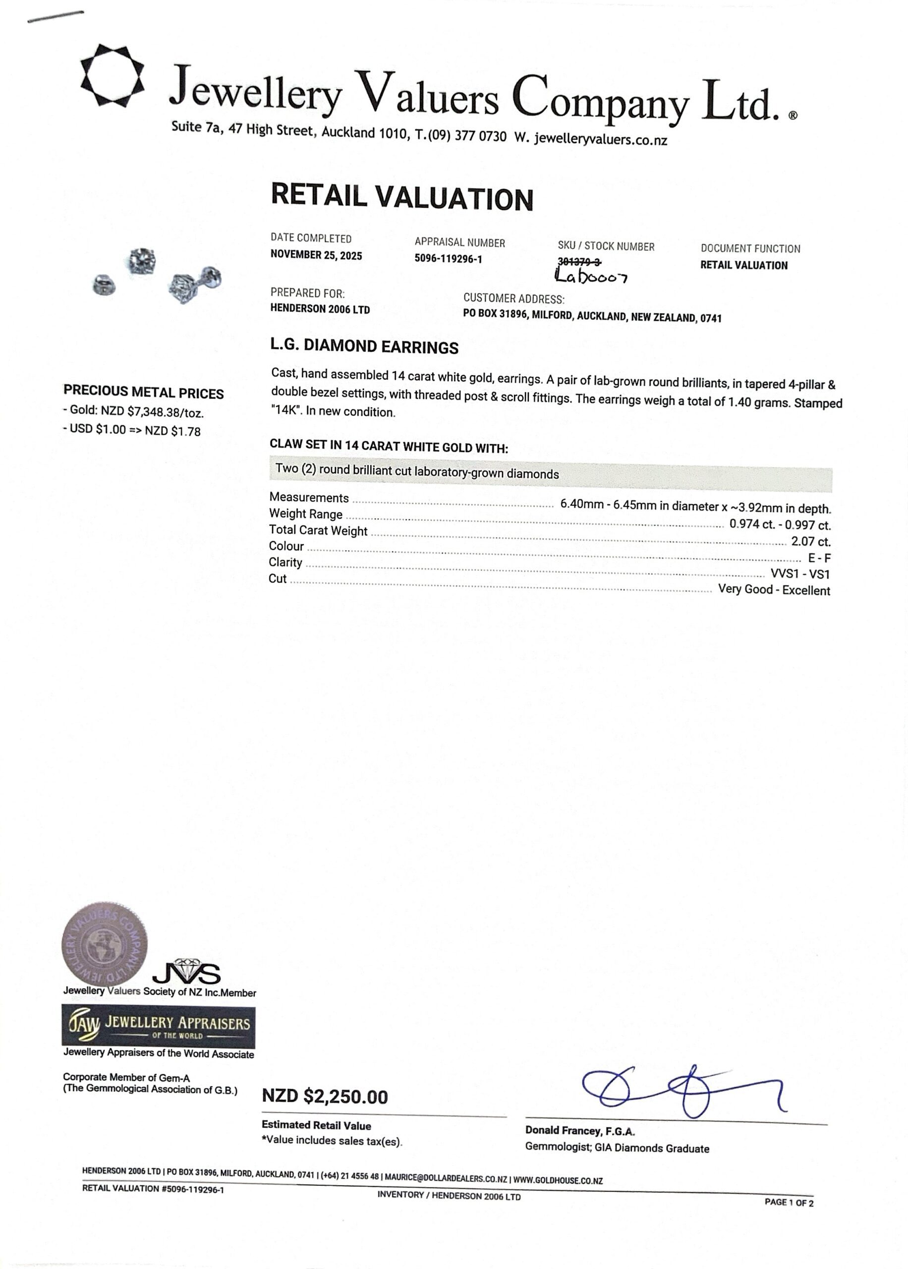 14KT W/G LAB DIAMOND STUDS TDW2.07CTS 1.40GMS + VAL