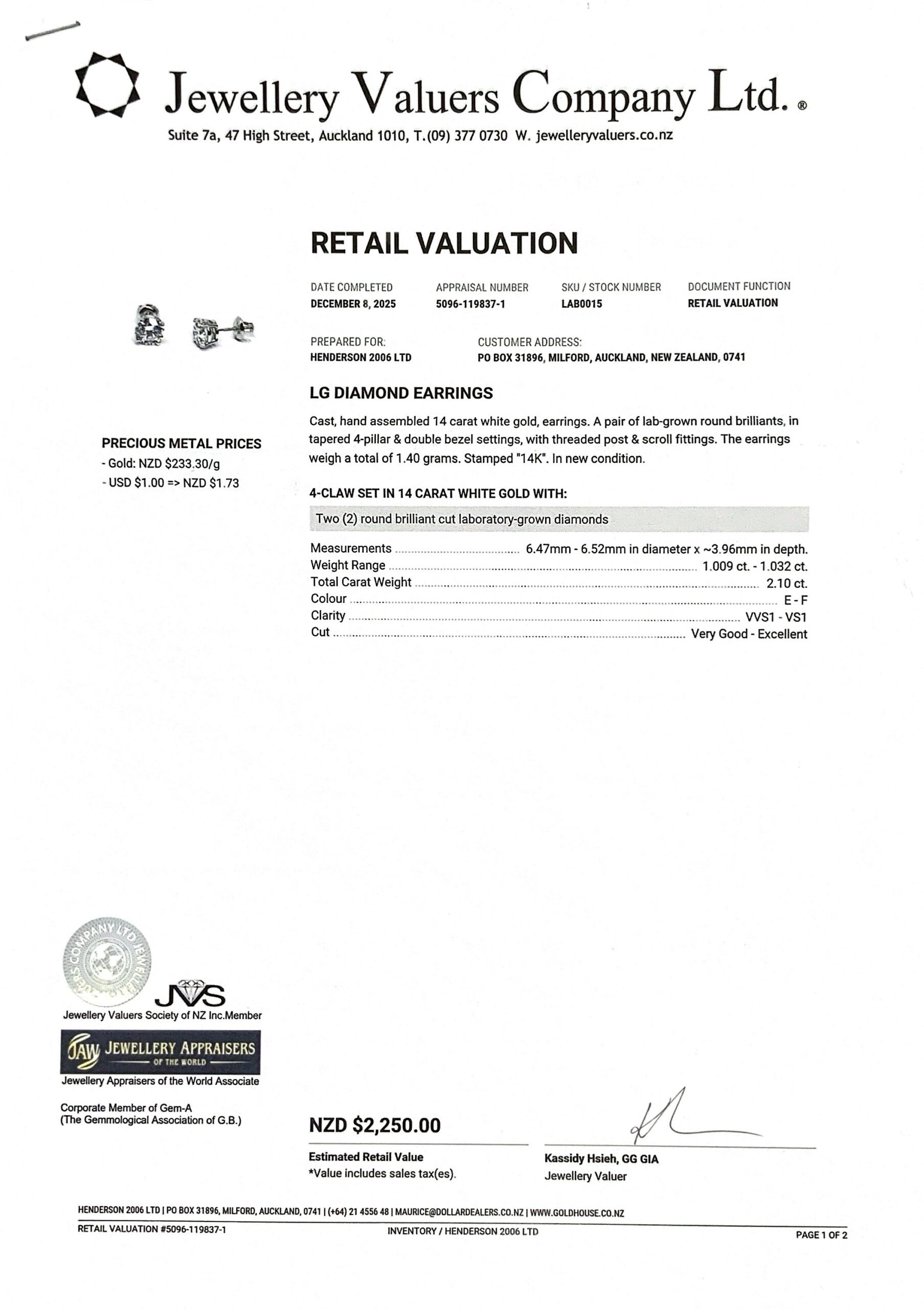 14KT W/G LAB DIAMOND STUDS TDW2.10CTS 1.40GMS + VAL