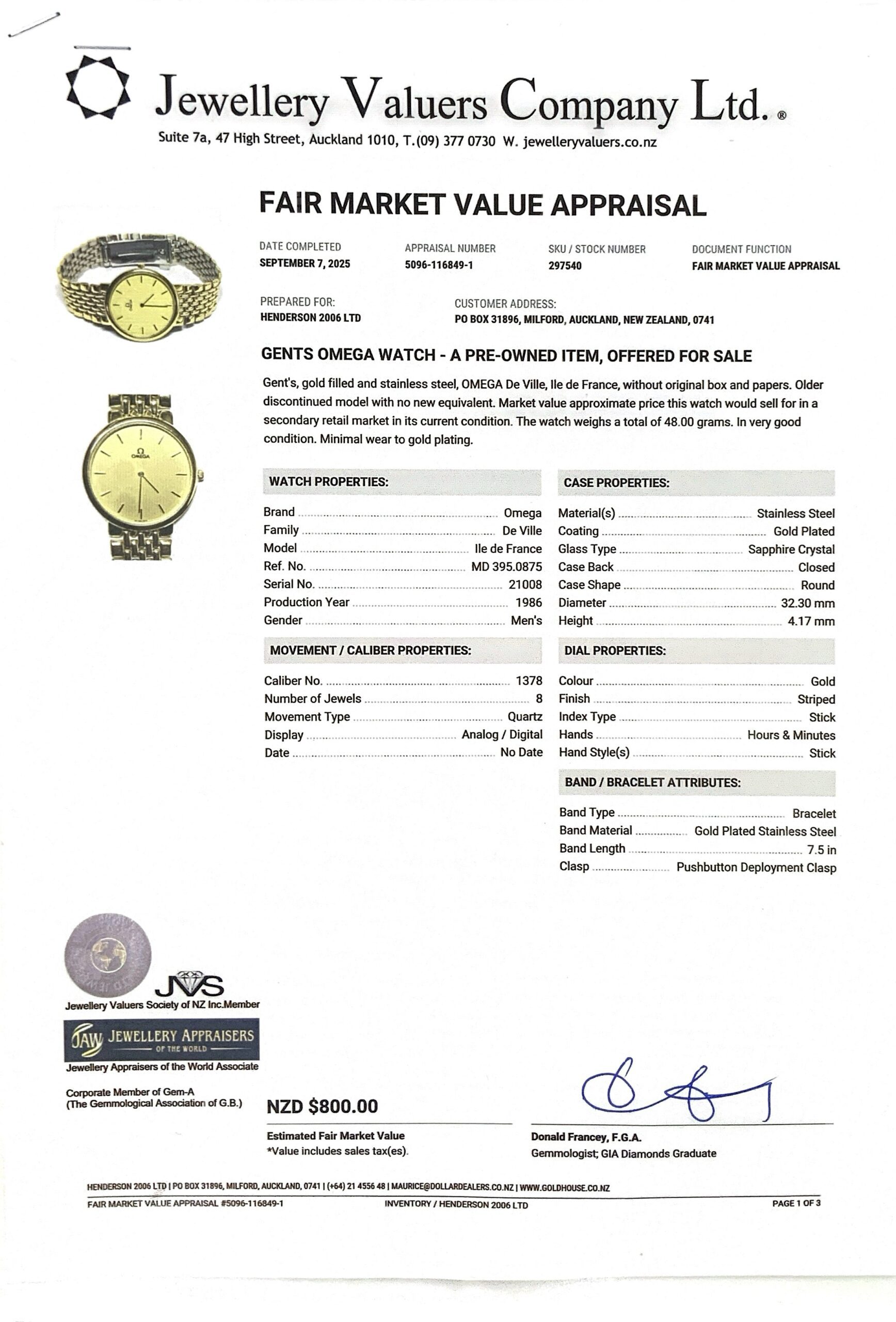 OMEGA DE VILLE ILE DE FRANCE 32MM (1986) WATCH 48.1GMS S/N:21008 + VAL (PLATED STAINLESS STEEL -SHOWS SOME SIGNS OF WEAR)