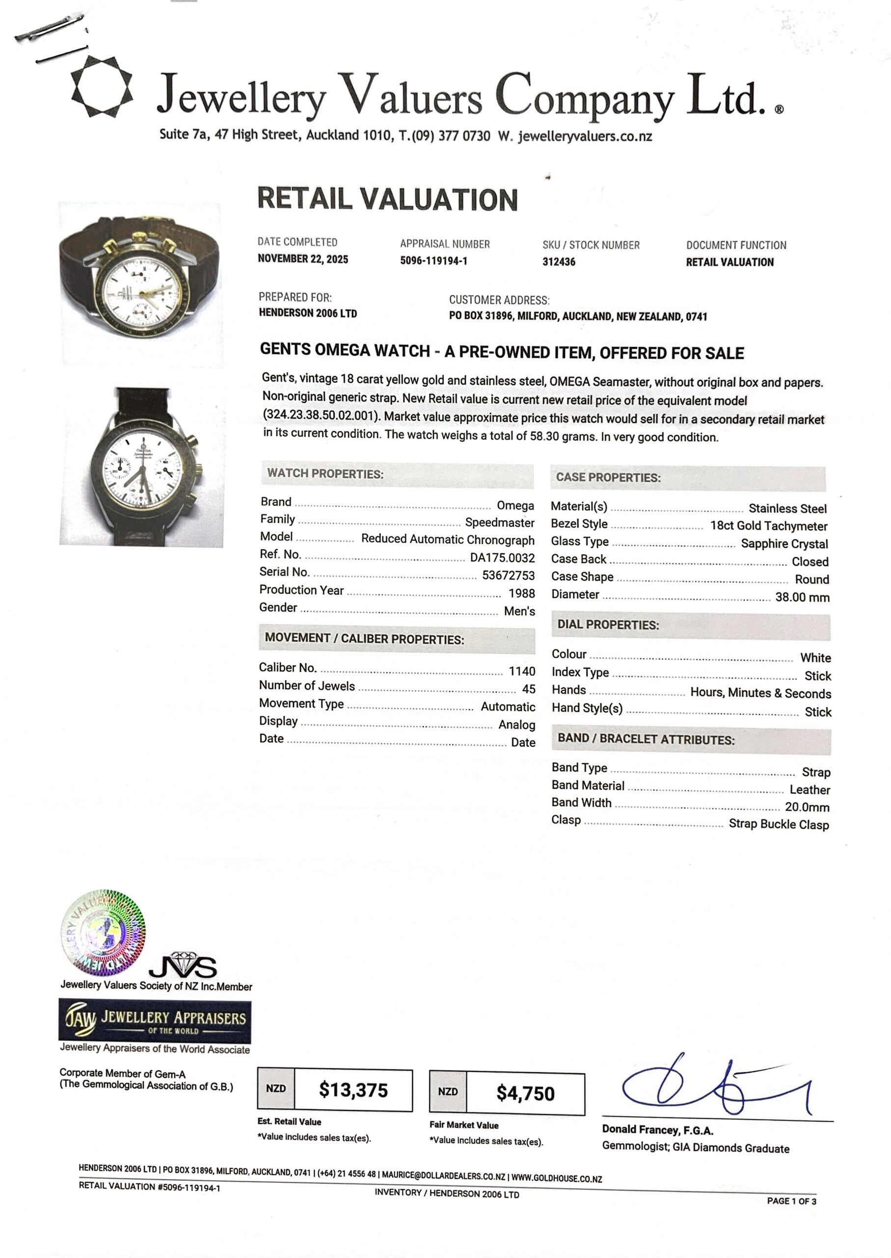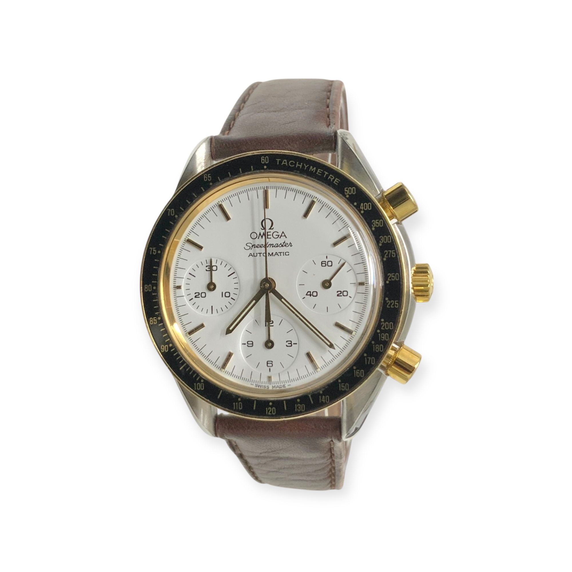 OMEGA SPEEDMASTER REDUCED AUTOMATIC 38MM WATCH 58.2GMS (1988) DA175.0032 S/N:53672753 + VAL (GENERIC LEATHER STRAP (SHOWS SIGNS OF WEAR)