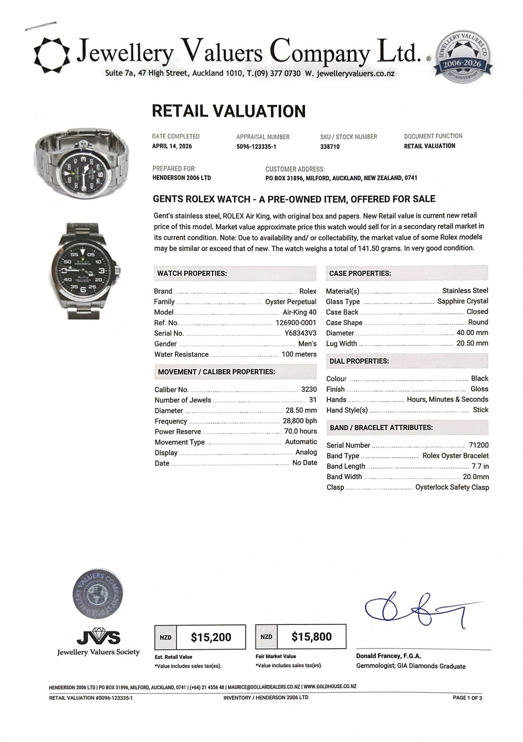 ROLEX AIR-KING (2022) 40MM WATCH 141.6GMS 126900-0001 S/N:Y68343V3 FULL SET + VAL
