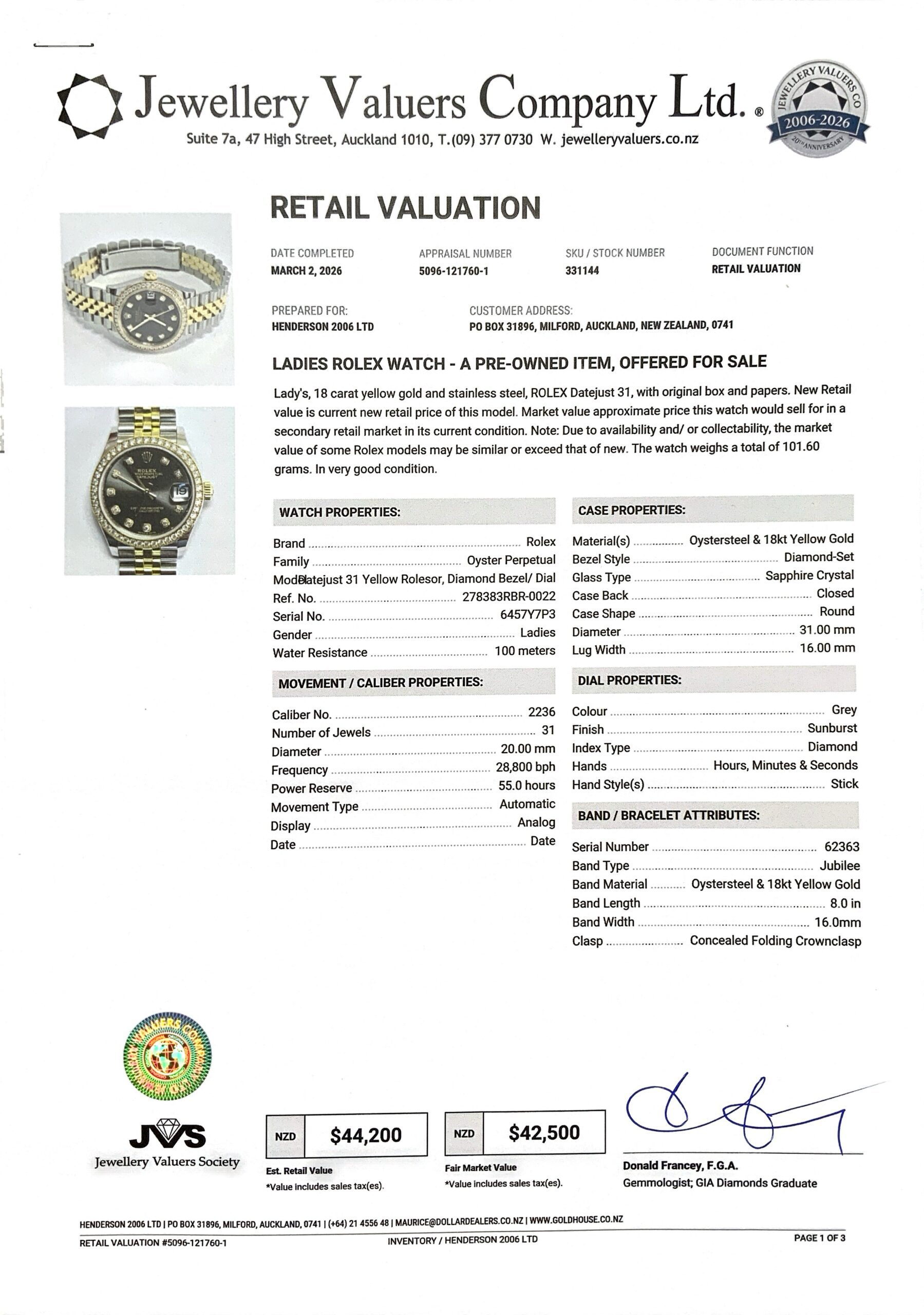 ROLEX 2TONE DATEJUST DIAMONDS DIAL DIAMOND BEZEL 31MM GREY DIAL WATCH 101.4GMS 278383RBR S/N:6457Y7P3 FULL SET + VAL