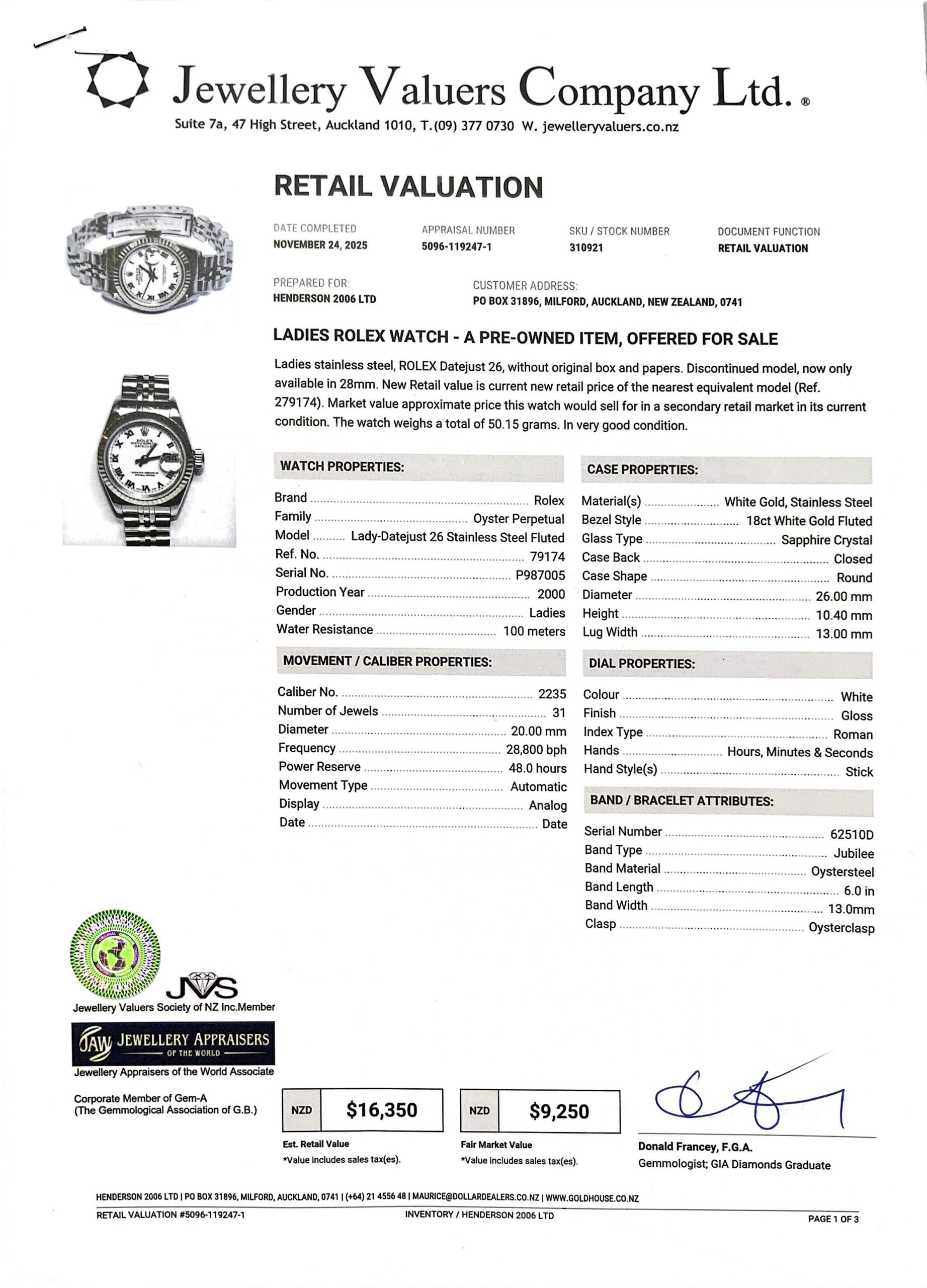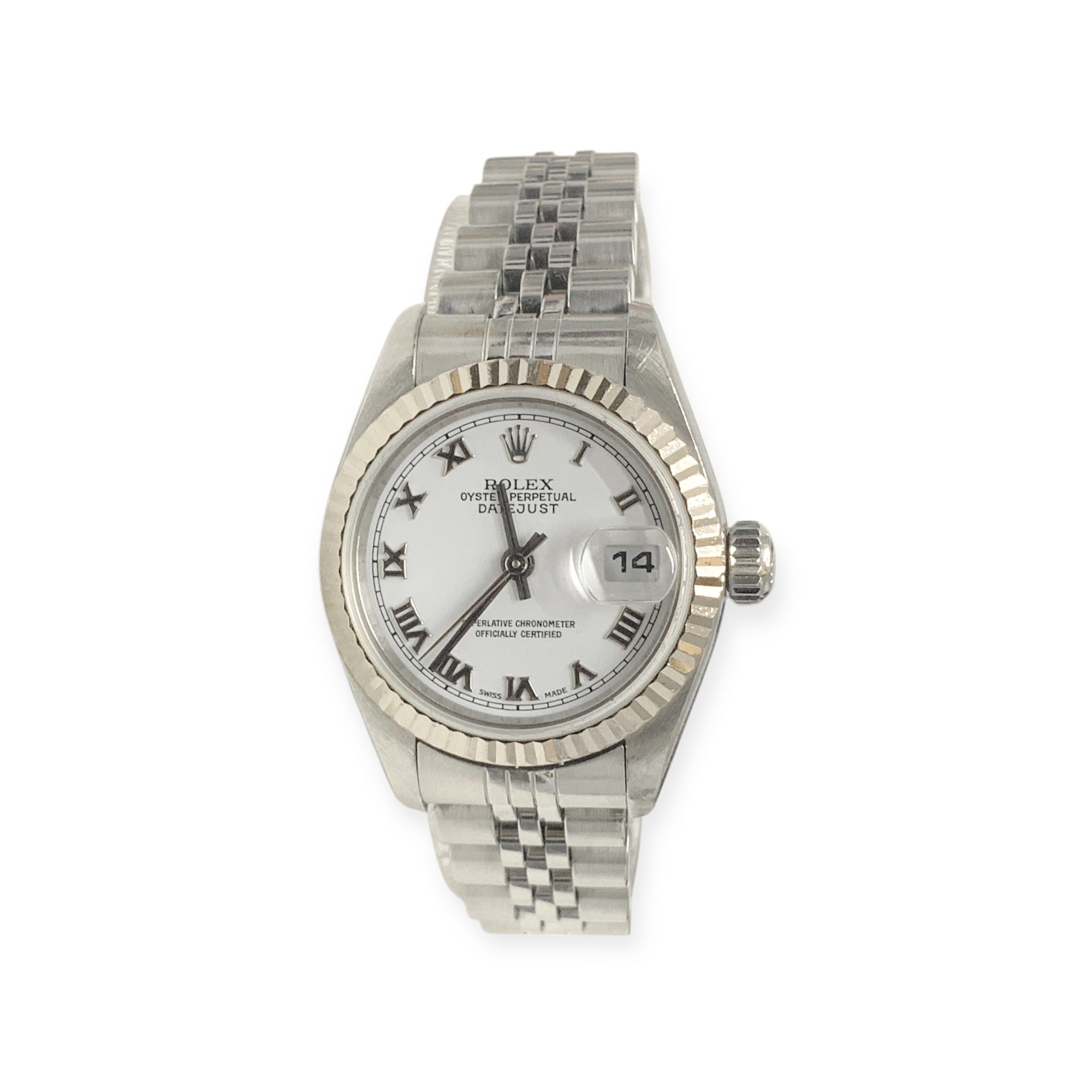 ROLEX LADY DATE JUST WHITE DIAL 26MM WATCH (2000) 50.2GMS 79174 S/N:P987005 + VAL (LOCK IS A BIT STIFF) (SHOWS SOME SIGNS OF WEAR)