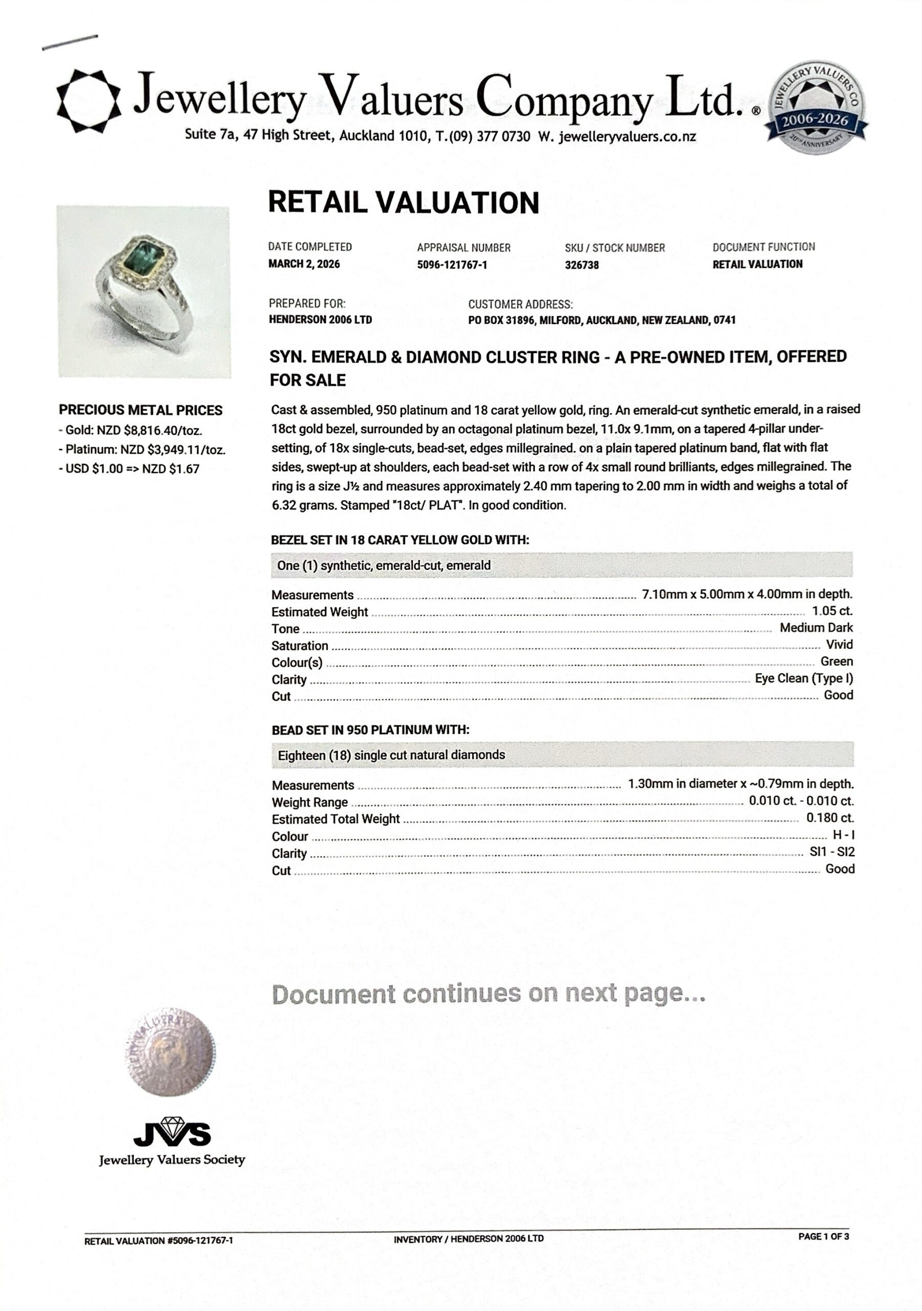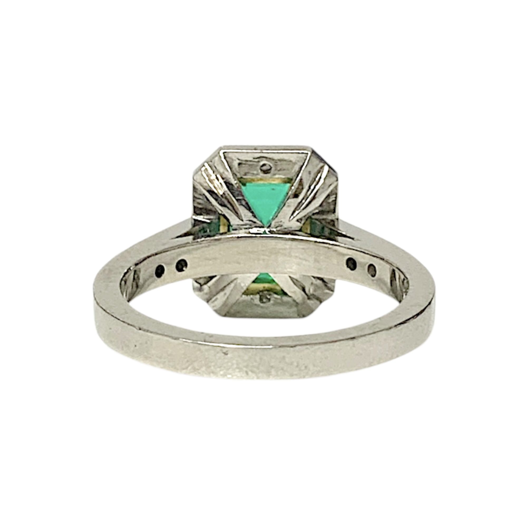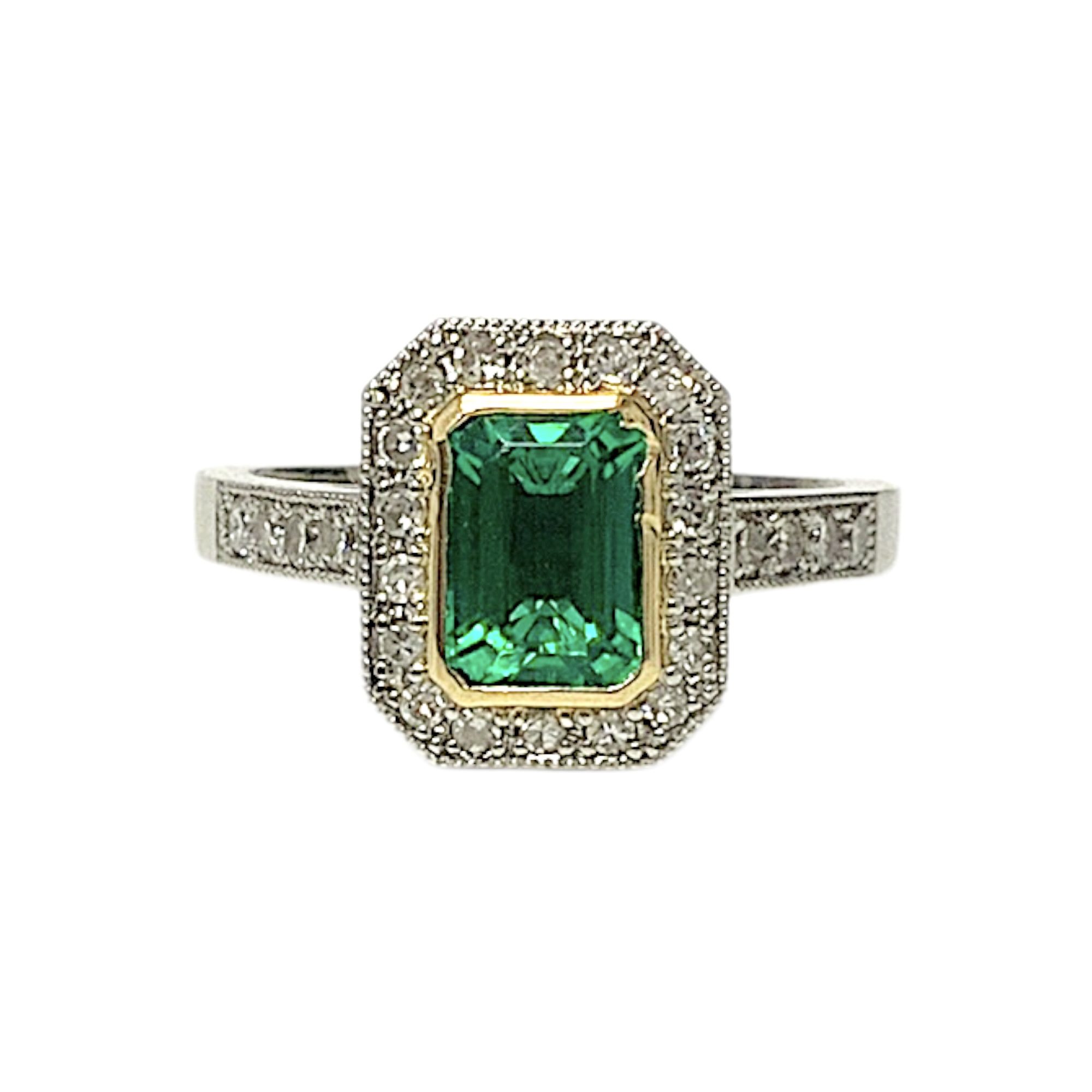 18CT TWO TONE PLATINUM SYN EMERALD RING 6.4GMS TDW0.18CTS + VAL