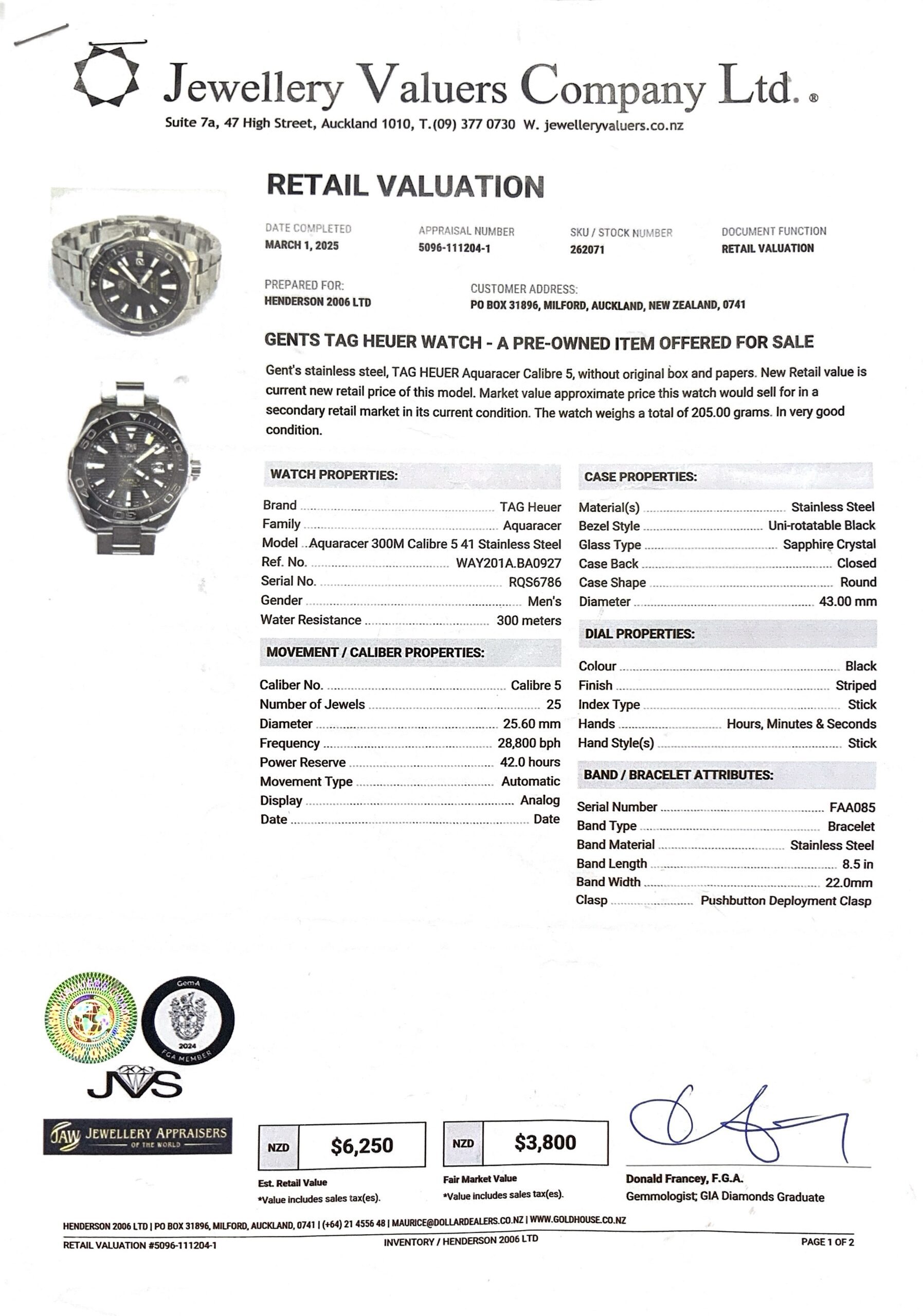 TAG HEUER AQUARACER 43MM WATCH 205.6GMS WAY201A-0 S/N:RQS6786 + VAL