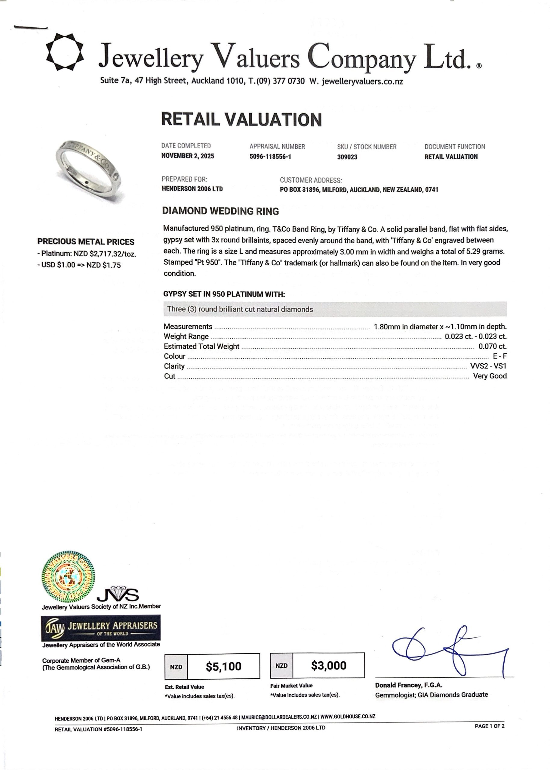 950 PLATINUM TIFFANY & CO. RING 5.3GMS TDW0.07CTS + VAL