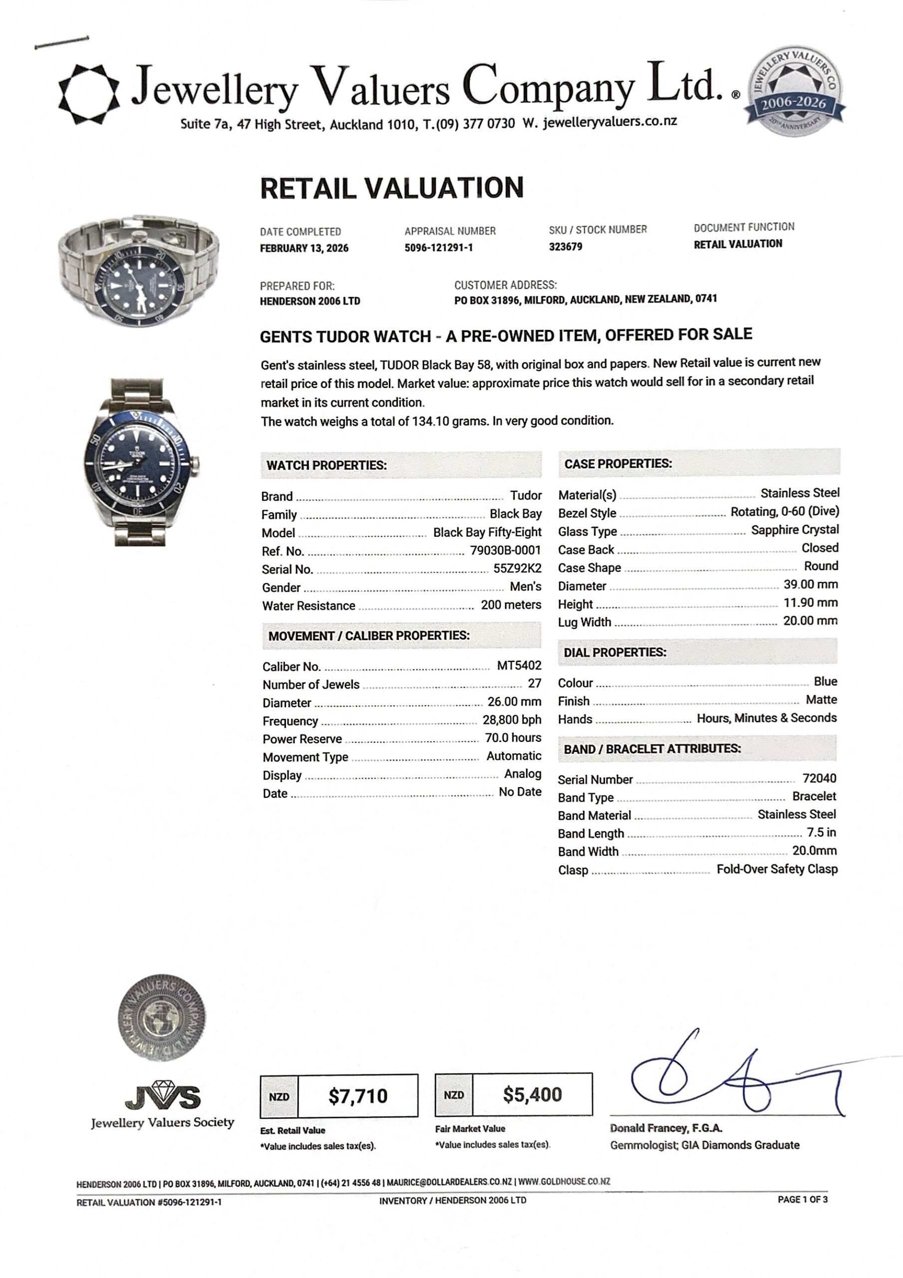 TUDOR S/STEEL BLACK BAY BLUE DIAL 39MM WATCH 134.1GMS 79030B S/N:55Z92K2 FULL SET + VAL